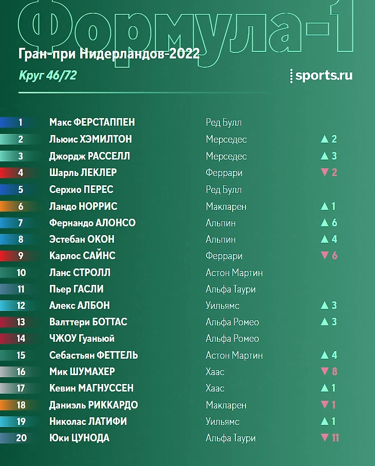 Впрочем, Ферстаппен явно не собирается отдавать победу. Макс легко обошел Расселла и теперь едет за Хэмилтоном. До лидера гонки 3 секунды. И у Макса, разумеется, лучший круг гонки. Но финиш может получиться любопытным.