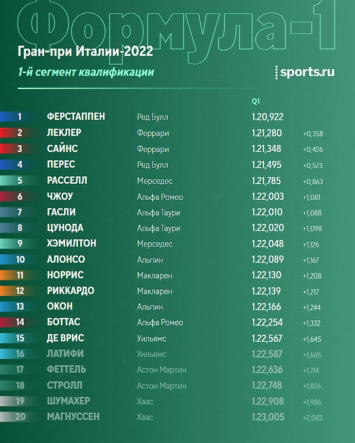 Закончился первый сегмент. Обошлось без особых сюрпризов. Из борьбы выбыли: Латифи, Феттель, Магнуссен, Стролл и Шумахер. Де Врис в первой же квалификации обошел напарника и прошел дальше! А лучшее время у Ферстаппена.