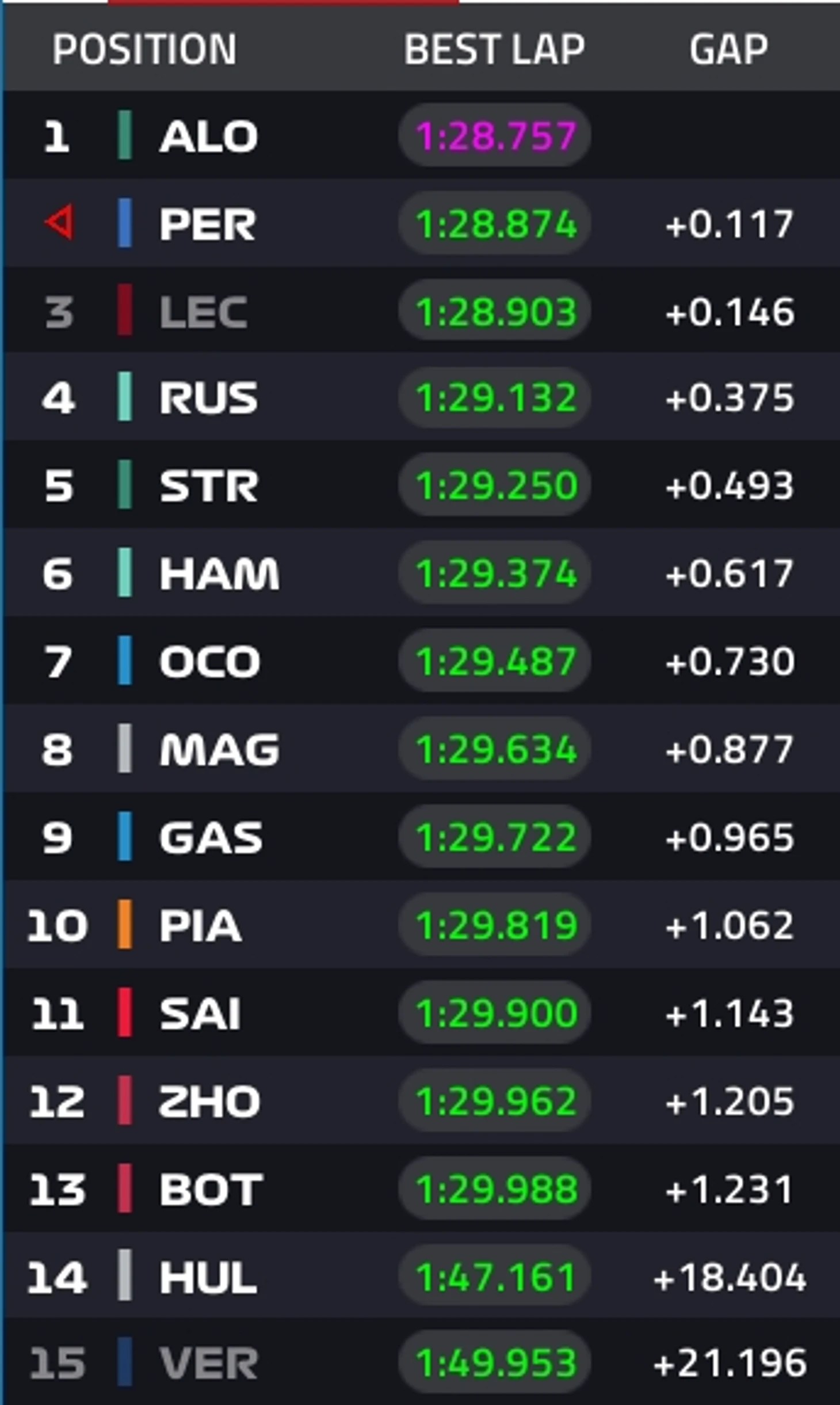 Перес, Леклер и Расселл (!) пока впереди Алонсо и Хэмилтона.