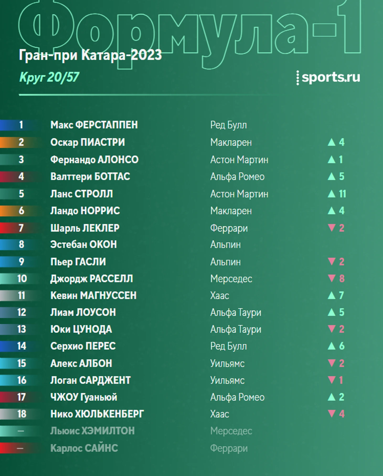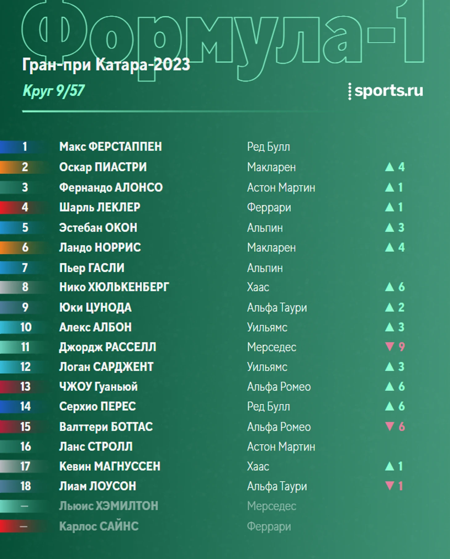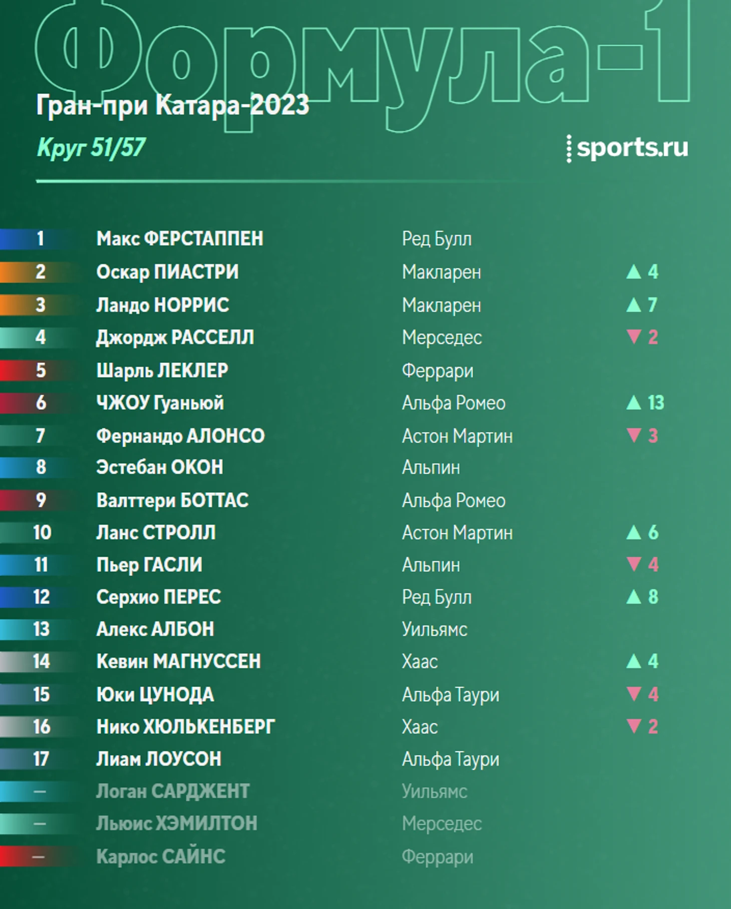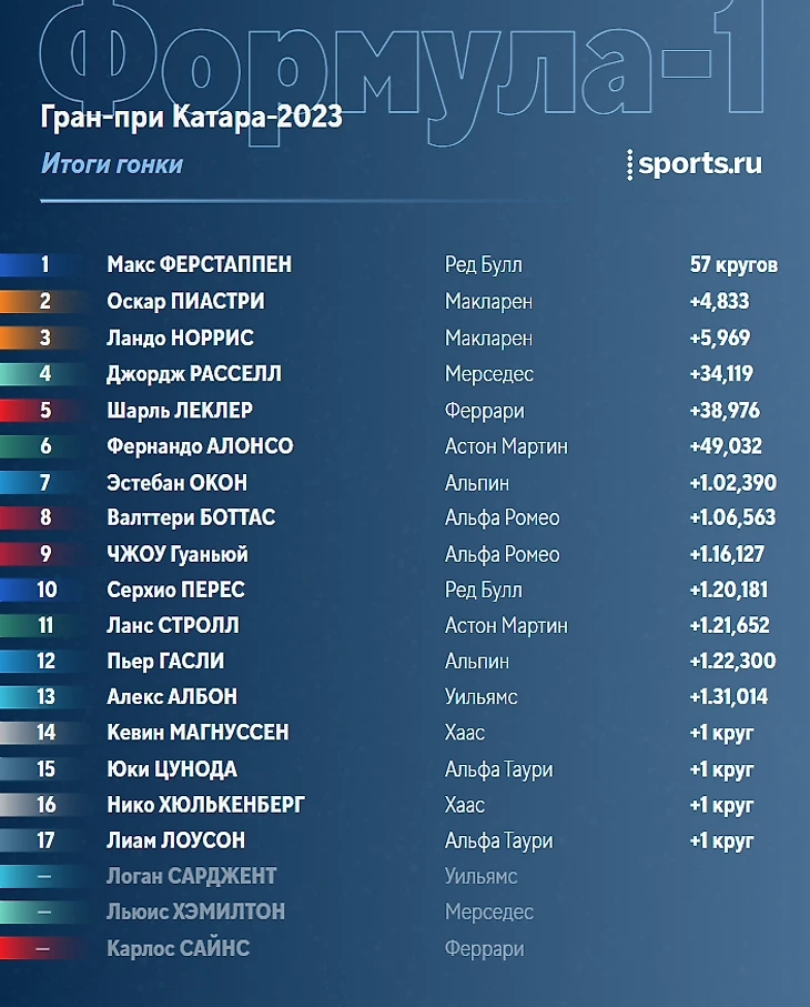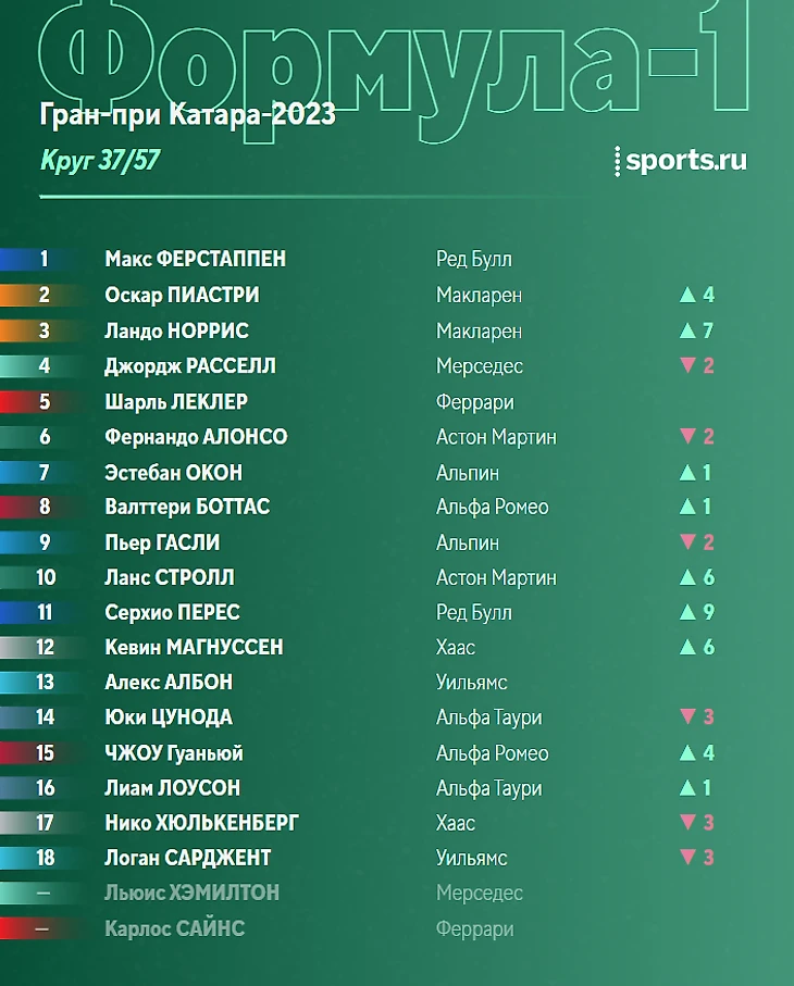 - Про скорость Макса, пожалуй, говорить будет лишним. Лучше отметим «Макларен», который набрал во второй половине сезона суперскую форму. Для команды это уже третий подиум подряд! И здесь же выделим Оскара Пиастри: в этой гонке он в очередной раз проявил необыкновенный талант - к концу финального круга Оскар все-таки опережал напарника по темпу. - «Мерседес» познал боль, а потом с трудом исправился. Если, конечно, так можно назвать четвертое место Джорджа Расселла. Вообще было бы интересно посмотреть, на что был бы способен сегодняшний «Мерседес», если бы не авария на первом круге. Все-таки в СМИ считали их конкурентами «Ред Булл» в Катаре. Но не сложилось. - Цунода против Албона. Главное сражение дня. Японец и таец боролись на протяжении всего Гран-при: за место в топ-10, во второй десятке, в первой десятке. Парни устроили красивую борьбу. Скажем им спасибо. - Пресловутые границы трассы. Когда-то эта проблема была наиболее актуальной для этапа в Австрии, но теперь она преследует «Ф-1» везде. И, если честно, это уже начинает походить на клоунаду. Тут остается только надеяться, что ФИА что-то наконец-то исправит эту проблему. - Что случилось с Сарджентом? Непонятный сход Логана действительно вызывает много вопросов - и беспокойство. Когда пилот вылезал из болида, здоровым его было трудно назвать. Тут остается только дождаться подробностей и пожелать Сардженту здоровья.