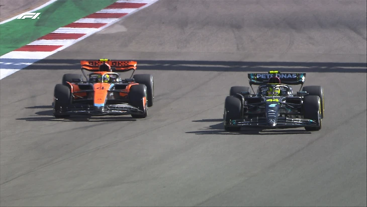 Хэмилтон окончательно догнал Норриса и уже получил право на DRS. Обгон оказался вопросом времени, хотя Норрис сопротивлялся до самого конца и максимально жестко.