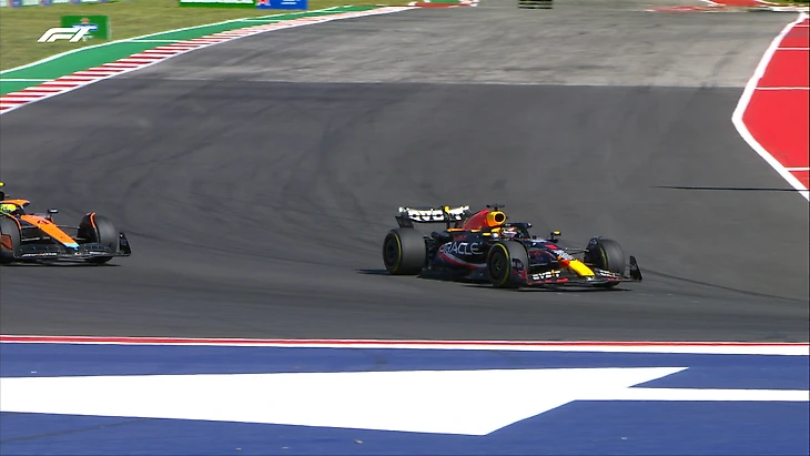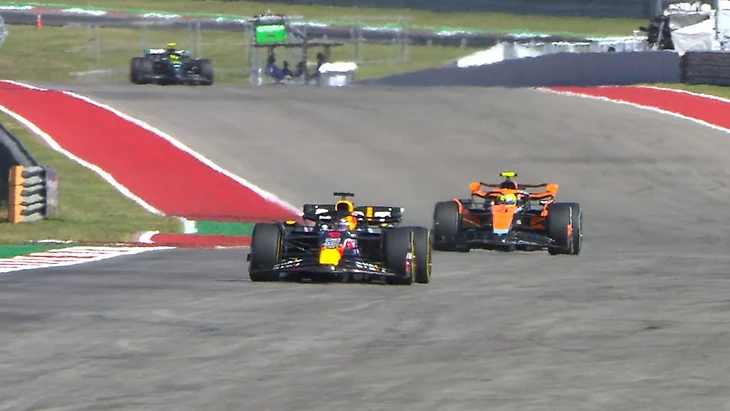 Норрис сообщил команде, что Ферстаппен уже дважды нарушил границы трассы. Макс постепенно отъезжает, стараясь вырваться из зоны DRS и лишить Ландо дополнительного инструмента.