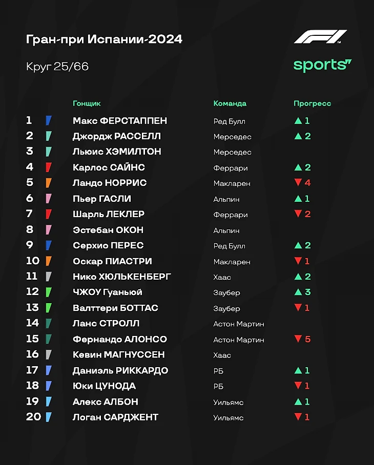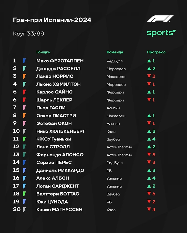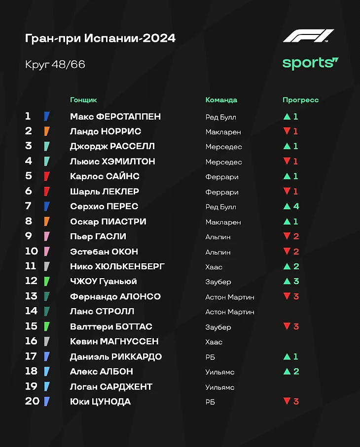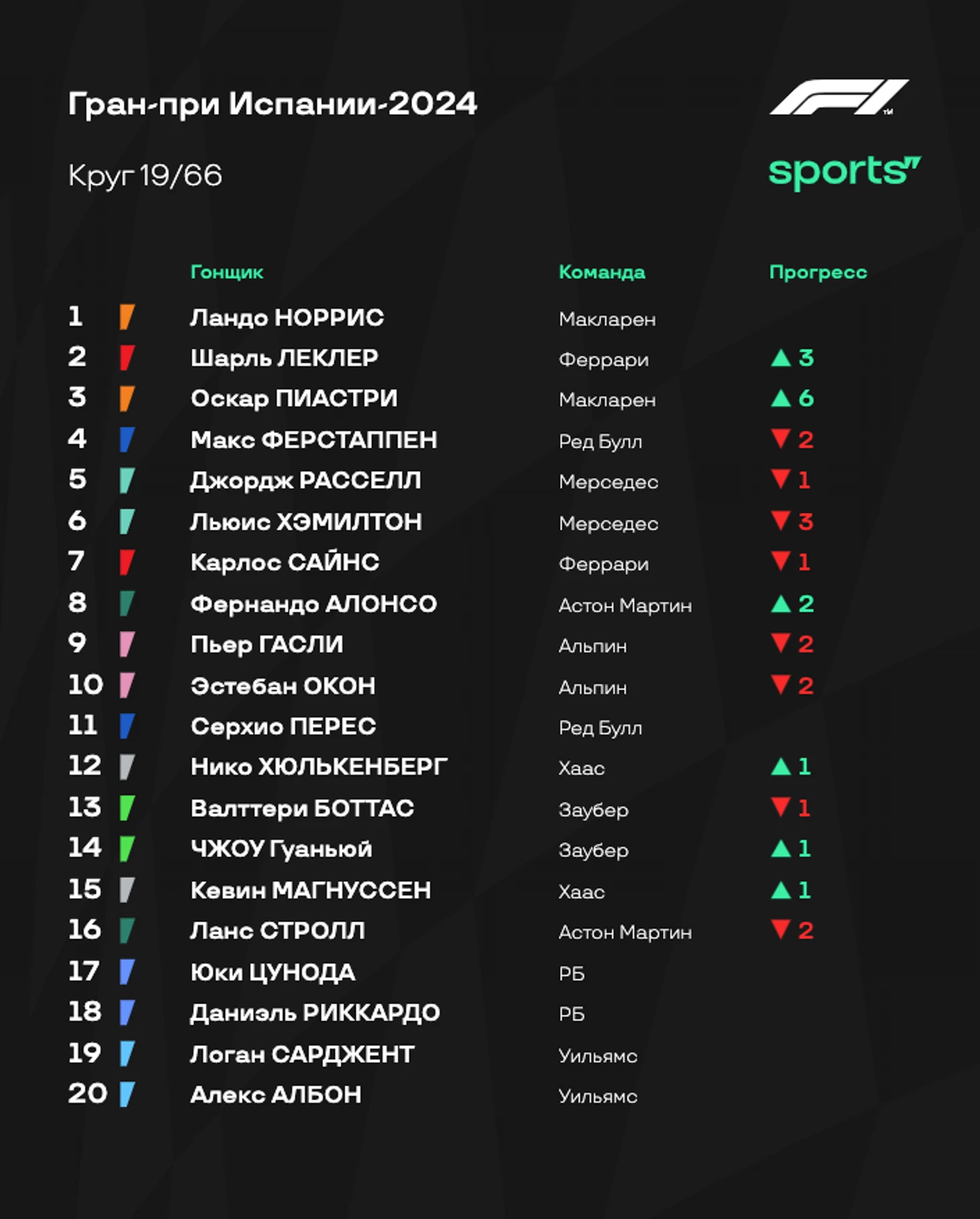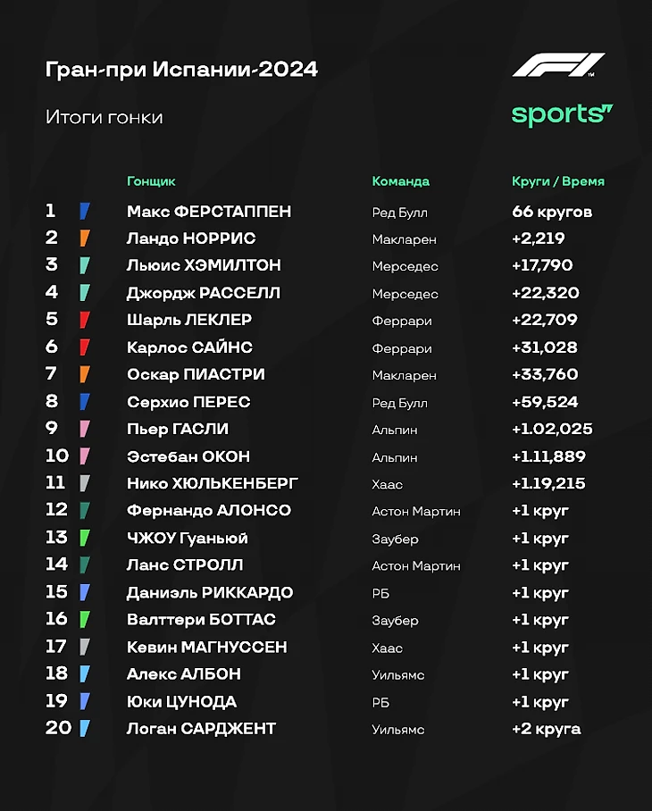 - Ферстаппен провел сильную гонку, определив ее исход практически в самом начале. Макс вовремя прошел Расселла, выдержал темп, а позже смог удержаться впереди атаковавшего Норриса. Не самая легкая, но и далеко не такая напряженная победа для «Ред Булл». - «Макларену» нужно учиться. В Испании было слишком много суеты и неуверенности при принятии стратегических решений (в частности, со стороны Норриса) - но даже так команде удалось под конец гонки отыграть немало времени у Макса. Вот только для победы этого не хватило. - Обновления «Мерседеса» и впрямь творят чудеса. Уже третью гонку подряд команда выглядит конкурентоспособной. Более того, это второй подиум «серебряных» подряд. Теперь посмотрим, как поведет себя машина в Австрии. - Трасса в Барселоне хорошо подошла «Альпин», и команда смогла провести сильную (по своим меркам) гонку. Вообще французы смогли оправиться от неудачного старта сезона и закрепиться в середине пелотона. Однако впереди все еще тонны работы. - А вот новинки «РБ» не работали от слова совсем. Непривычно слабая гонка для младшей команды «быков», но вполне возможно, дело опять же в конфигурации трассы. В команде хотят посмотреть, как поведет себя болид на других треках - вполне возможно, там ситуация станет лучше.