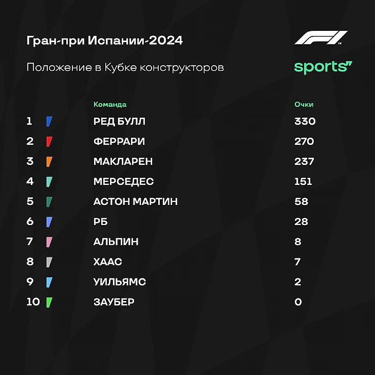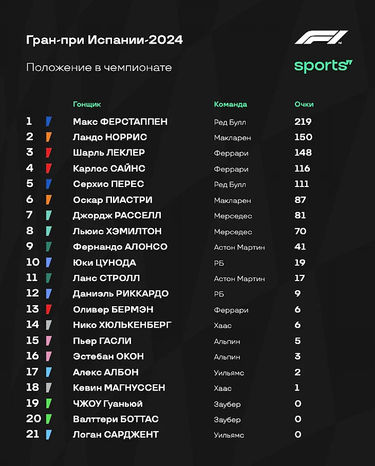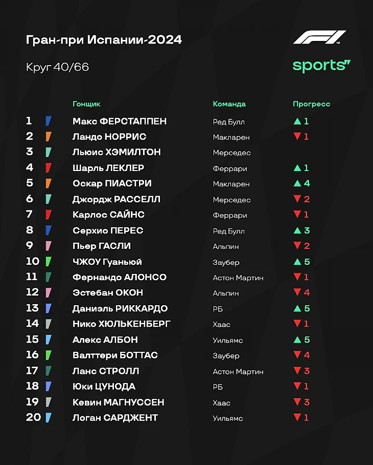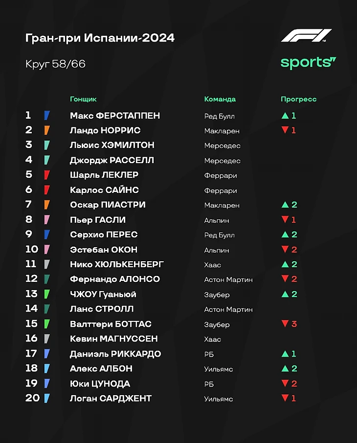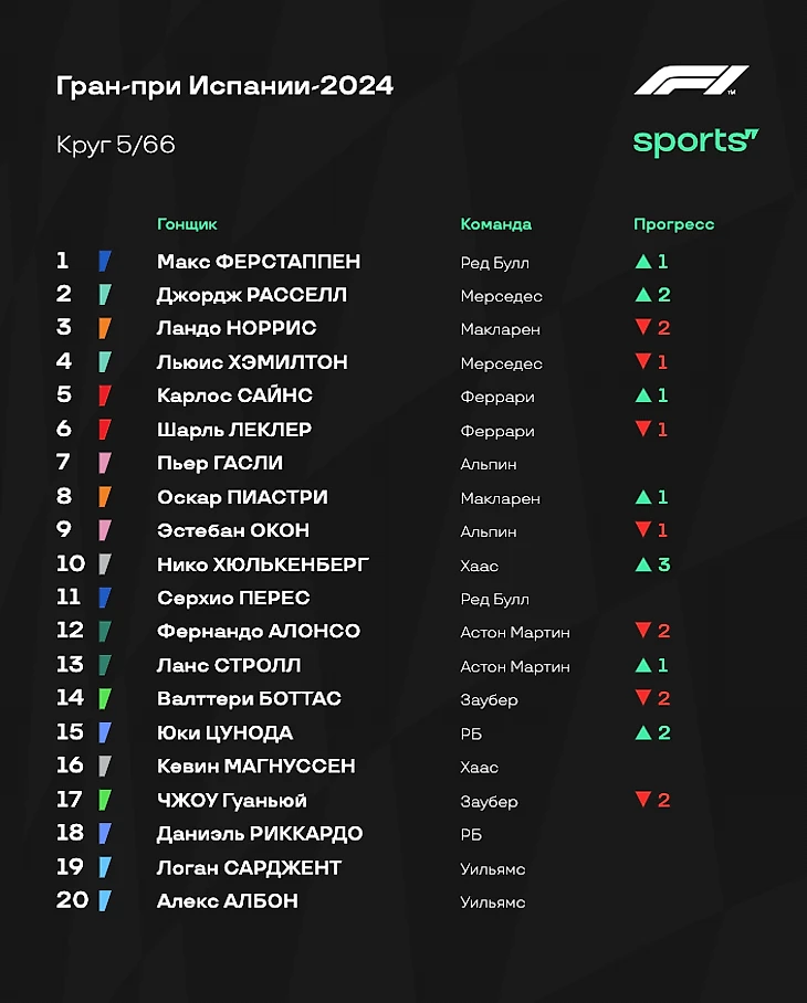 - Ферстаппен провел сильную гонку, определив ее исход практически в самом начале. Макс вовремя прошел Расселла, выдержал темп, а позже смог удержаться впереди атаковавшего Норриса. Не самая легкая, но и далеко не такая напряженная победа для «Ред Булл». - «Макларену» нужно учиться. В Испании было слишком много суеты и неуверенности при принятии стратегических решений (в частности, со стороны Норриса) - но даже так команде удалось под конец гонки отыграть немало времени у Макса. Вот только для победы этого не хватило. - Обновления «Мерседеса» и впрямь творят чудеса. Уже третью гонку подряд команда выглядит конкурентоспособной. Более того, это второй подиум «серебряных» подряд. Теперь посмотрим, как поведет себя машина в Австрии. - Трасса в Барселоне хорошо подошла «Альпин», и команда смогла провести сильную (по своим меркам) гонку. Вообще французы смогли оправиться от неудачного старта сезона и закрепиться в середине пелотона. Однако впереди все еще тонны работы. - А вот новинки «РБ» не работали от слова совсем. Непривычно слабая гонка для младшей команды «быков», но вполне возможно, дело опять же в конфигурации трассы. В команде хотят посмотреть, как поведет себя болид на других треках - вполне возможно, там ситуация станет лучше.