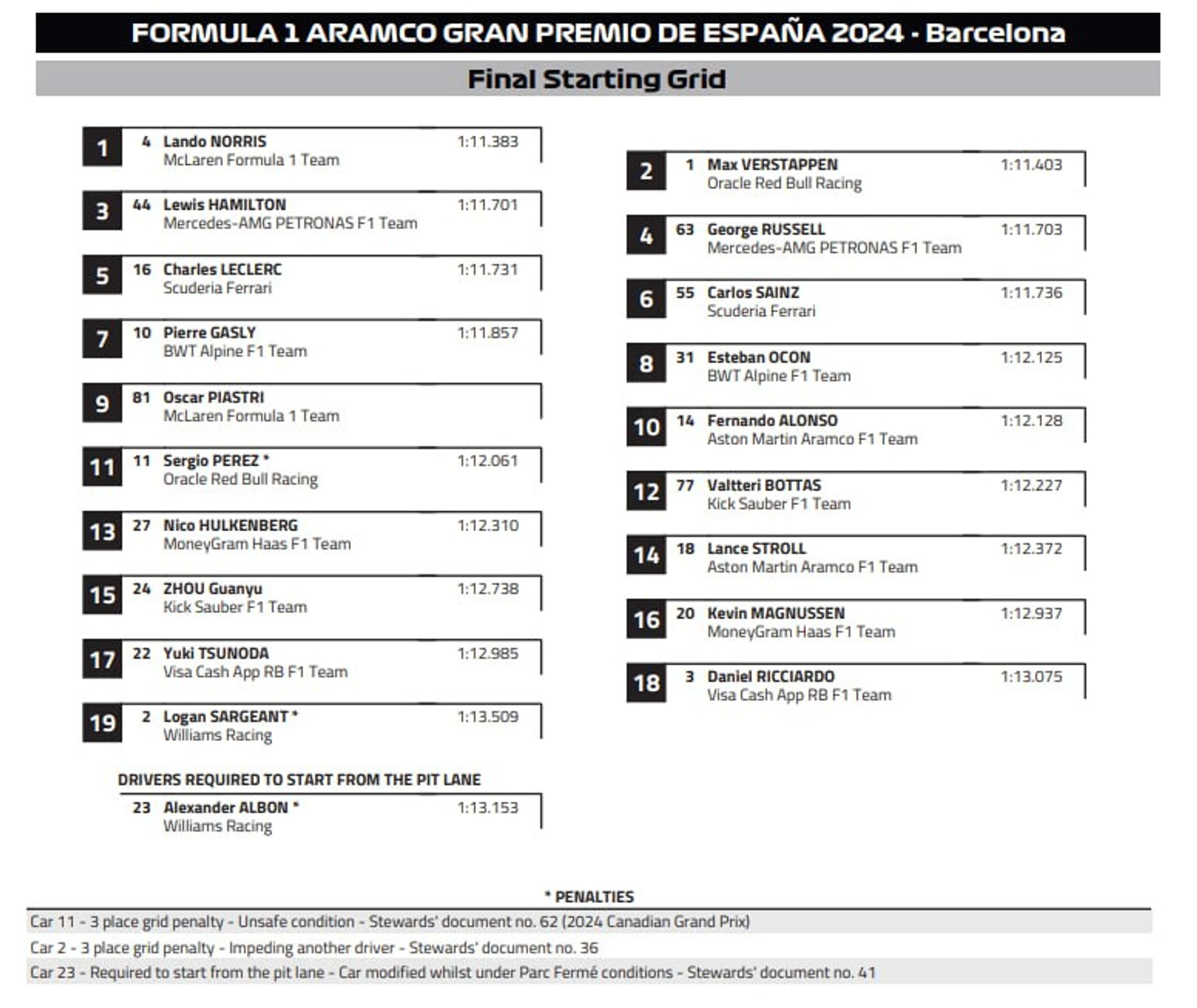 Перед гонкой небольшие изменения: Алекс Албон начнет гонку с пит-лейна. «Уильямс» нарушил правило закрытого парка и поменял накопитель энергии и блок управляющей электроники в силовой установке болида тайца.