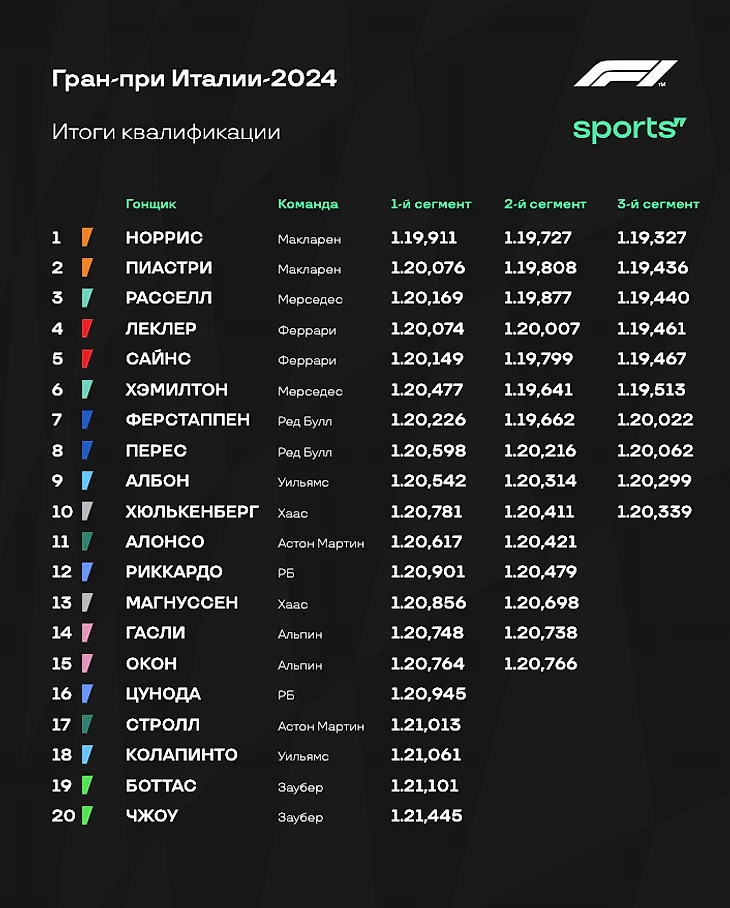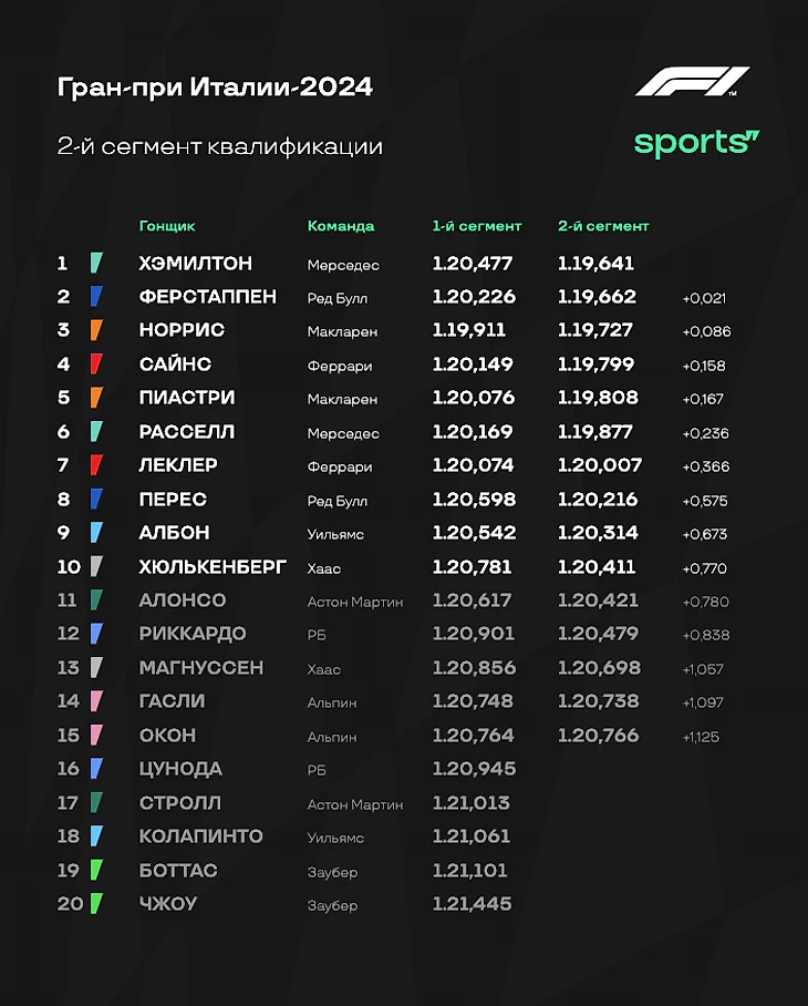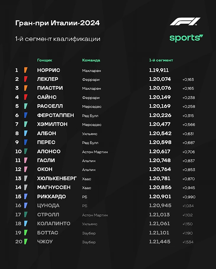 Все, закончился первый сегмент. Из борьбы выбывают: Цунода, Стролл, Колапинто, Боттас и Чжоу. В целом без сюрпризов.