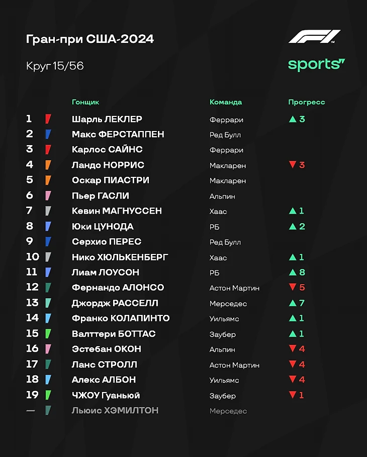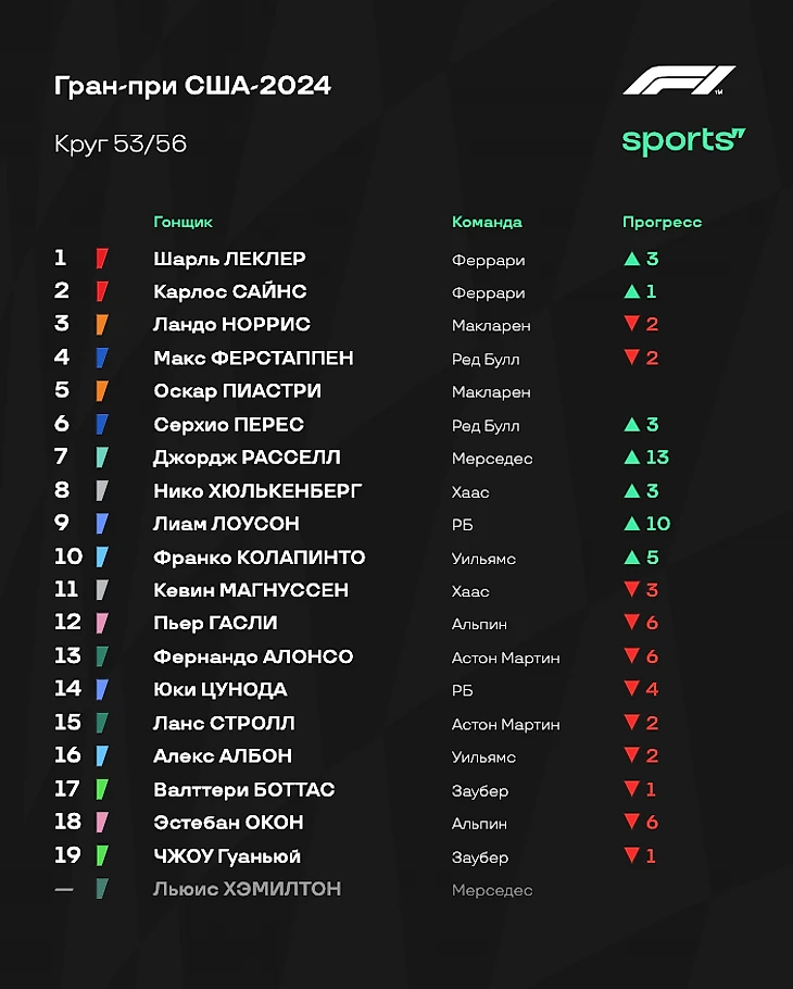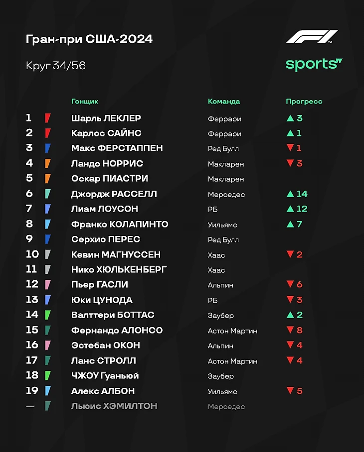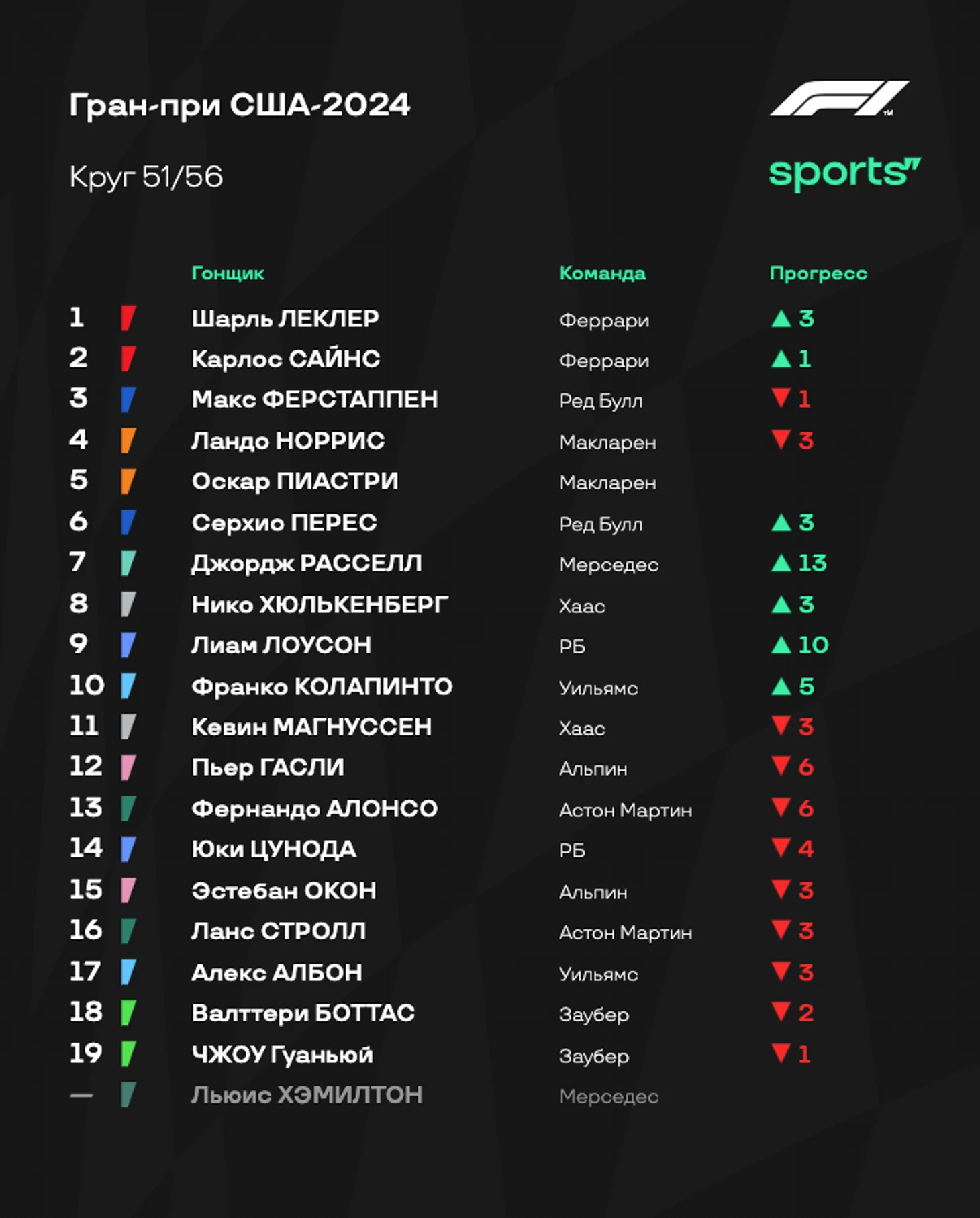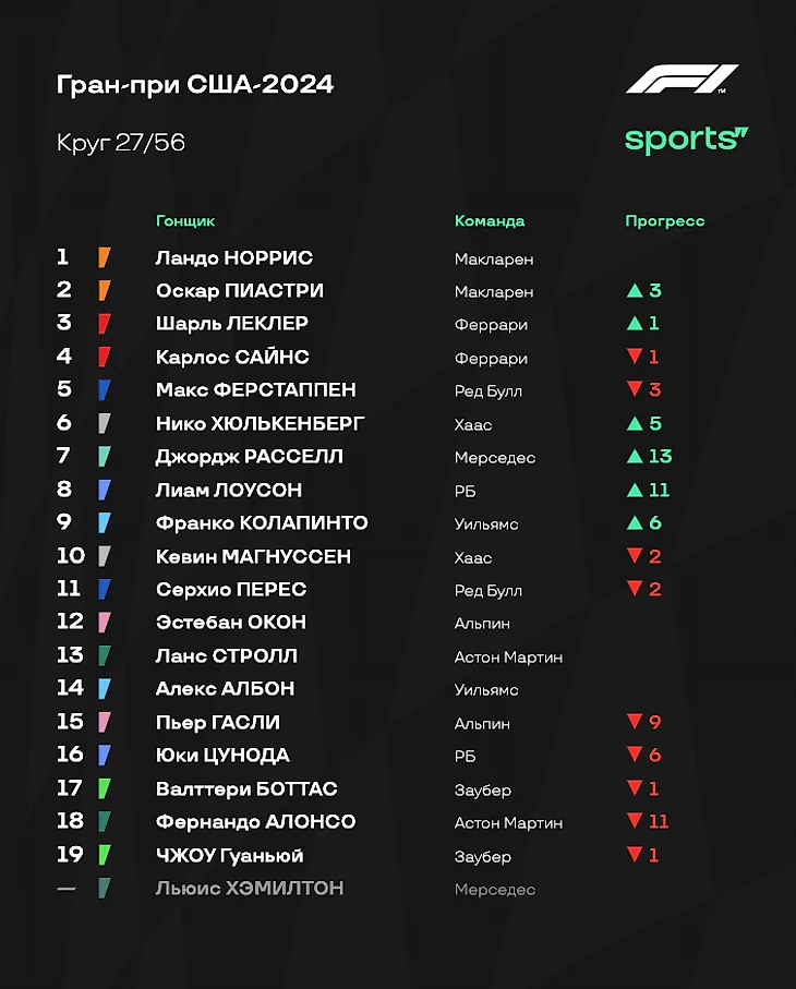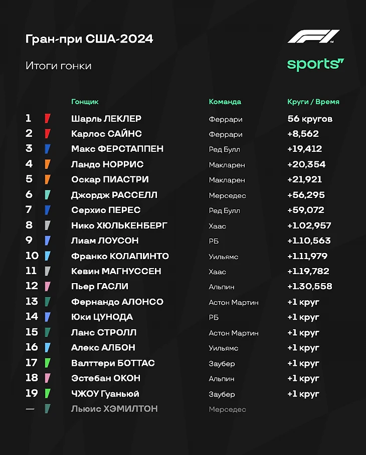 - «Феррари» провели очень сильную гонку. Ни с Сайнсом, ни с тем более Леклером никто не мог сравниться. Скудерия оказалась великолепна во всех аспектах: и в чистом темпе, и в плане работы с шинами. Как и предсказывали пилоты, болид в Остине работал очень хорошо - возможно, теперь у «Феррари» есть отличная основа, а значит, в грядущим уик-эндах может произойти прогресс. - Борьба Норриса и Ферстаппена перетянула все внимание с победы Леклера на себя. Уже когда Ландо подбирался к Максу, было ощущение, что произойдет что-то серьезное. Прямого контакта не случилось, но инцидент все-таки есть. Мнения у обеих сторон кардинально отличаются, подождем послегоночных комментариев. - «Мерседес» минимизировал потери. Расселлу нужно отдать должное: после ужасной квалификации, которую он завершил досрочно из-за аварии, Джордж стартовал с пит-лейна в результате долгого ремонта - но даже так финишировал шестым. И это важно, если учитывать провал Хэмилтона. Льюис перестарался на первых кругах и из-за потери сцепления улетел в гравий. Семикратный выглядел максимально расклеенным в США, - «Хаас» прогрессирует. Хюлькенберг финишировал восьмым - важные очки для Кубка Конструкторов, которые позволили американцам закрепиться на шестом месте. - Лоусон сотворил чудо. С последнего места Лиам прорвался на 9-е. Очень достойное выступление новозеландца с множеством борьбы, хорошим контролем резины. Цунода был шокирован, увидев перед собой напарника - такими темпами место в «Ред Булл» ускользнет к Лоусону. - Будет кощунством, если мы также не отметим Франко Колапинто. Аргентинец продолжает поражать своими выступлениями. На сей раз он приехал 10-м, привезя очко для «Уильямса» - и это на фоне слабого выступления Алекса Албона. Франко продолжает работать на то, чтобы остаться в «Формуле-1». Может, «Ауди» и вправду стоит присмотреться к нему? Гран-при США получился очень зрелищным. Гонка явно запомнится - будем надеяться, что следующий этап получится не менее ярким. Этап в Мексике пройдет с 25 по 27 октября - вы сможете наблюдать за ним вместе с нами на «Спортсе»! Мы будем ждать!