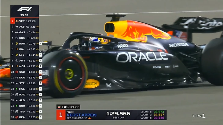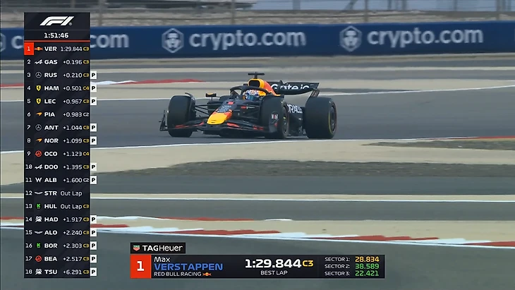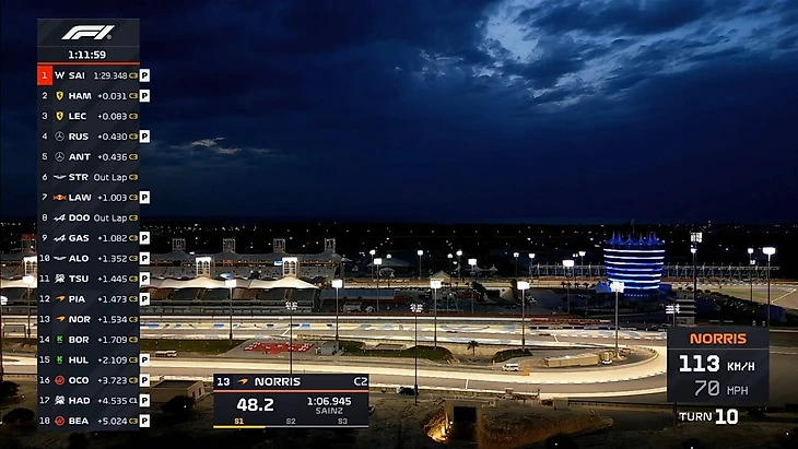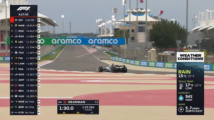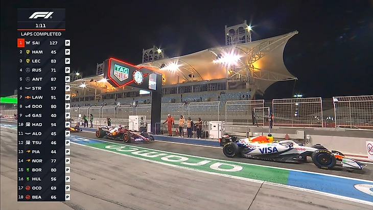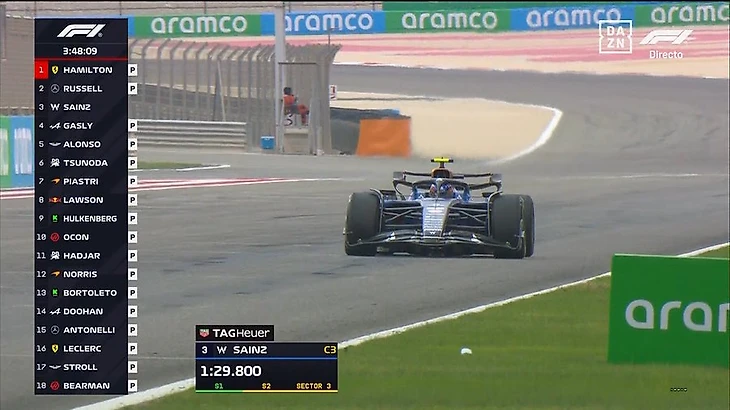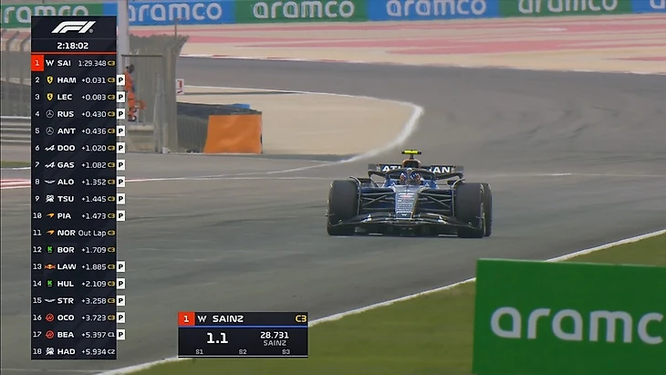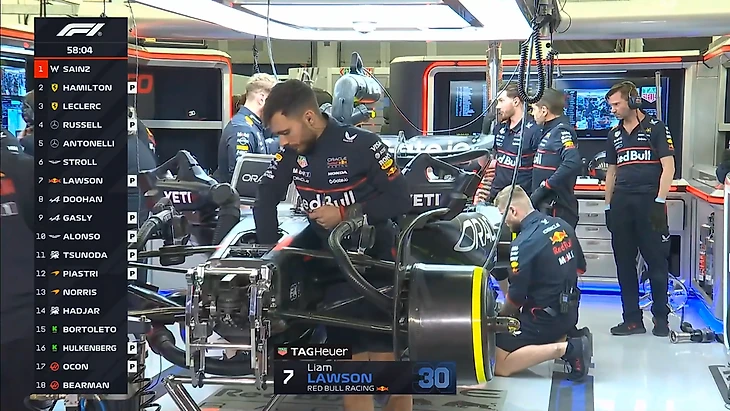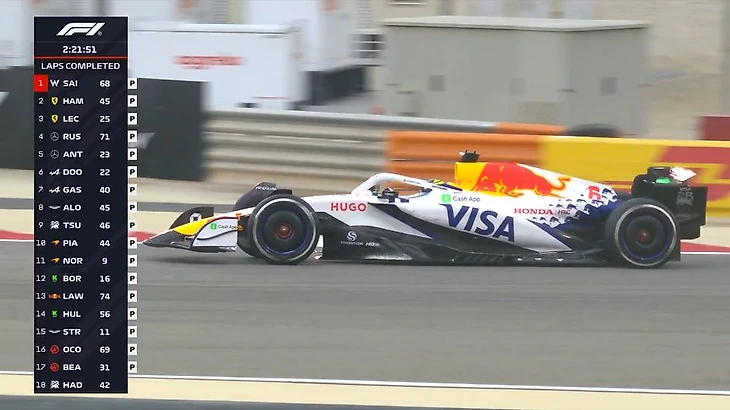 Пилоты очень активно работают на трассе. За час мы увидели много стартов с места (на выезде с пит-лейн), проверок темпа на длинных отрезках. В частности, Карлос Сайнс проехал дистанцию в гоночных условиях, собрав для «Уильямса» ценные данные. К концу часа на трассе были все болиды, кроме Лиама Лоусона - но он до этого тоже активно собирал информацию на треке.