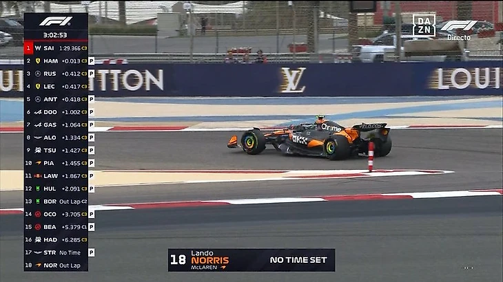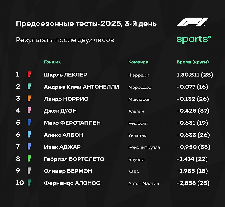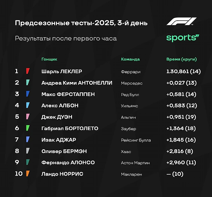 Сайнс все еще остается лидером тестов, следом идут сразу две «Феррари» (Леклер показал третье время). Лоусон успели починить, а Ландо Норрис появился на трассе в самом конце часа - «Макларен» довольно долго перенастраивал болид. В целом пока пилоты активно работают на трассе. Новичок «Мерседеса» Антонелли уже дважды заблокировал шины, но все-таки показал пятое время, оказавшись всего лишь в паре тысячных секунды от напарника Расселла.