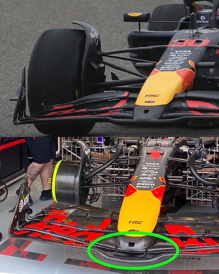 Австрийцы тестируют другой нос - более округлый и соединенный со вторым элементом антикрыла, а не с главным. Вчерашняя версия - сверху, сегодняшняя - снизу.