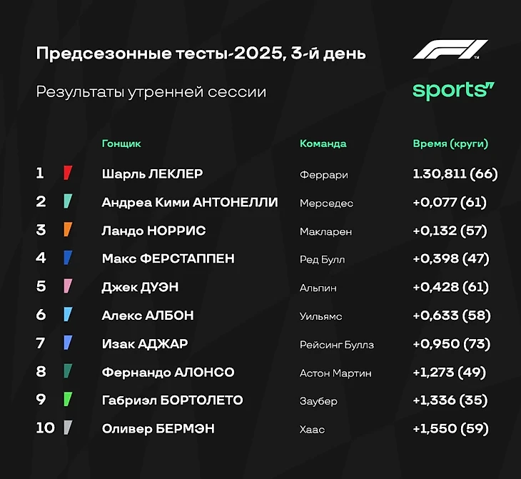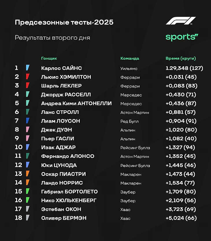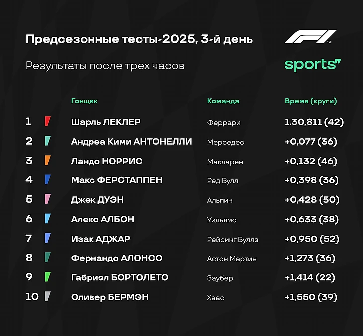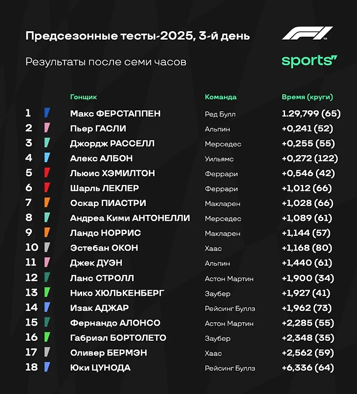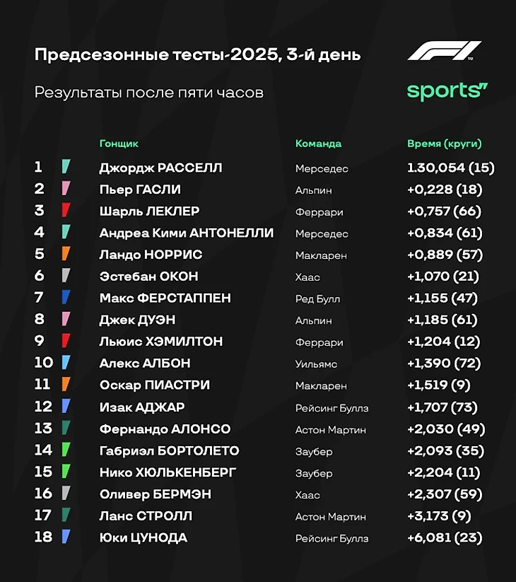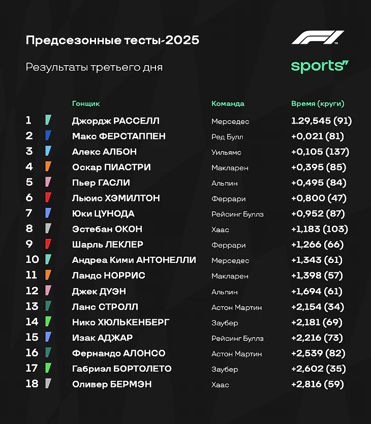 - «Мерседес», кстати, также заканчивает тесты лидером по количеству пройденных кругов - 458. Правда всего на 1 круг меньше у «Хааса», и на 4 - у «Ред Булл». А вот у остальных команд уже меньше 400 пройденных кругов за три дня тестов.