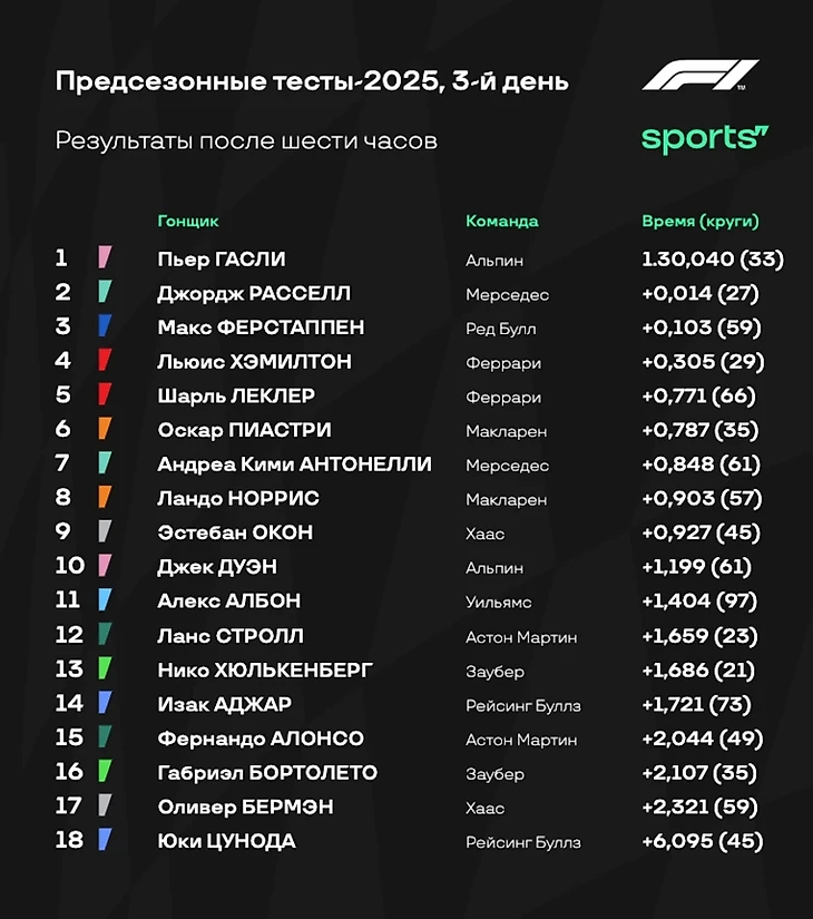 «Альпин» – Дуэн «Хаас» – Бермэн «Рейсинг Буллз» – Аджар «Уильямс» – Сайнс «Заубер» – Бортолето