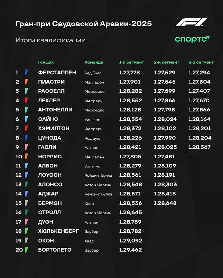Леклер уступил Расселлу чуть больще 0,250 секунды, но опередил Антонелли. САйнс при этом обогнал Хэмилтона, который продолжает страдать за рулем «Феррари». Цунода больше 8-го места ничего сделать не смог, но и так неплохо. Последним среди активных участников стал Гасли. Ну а 10-е место - у разбившего болид Норриса.