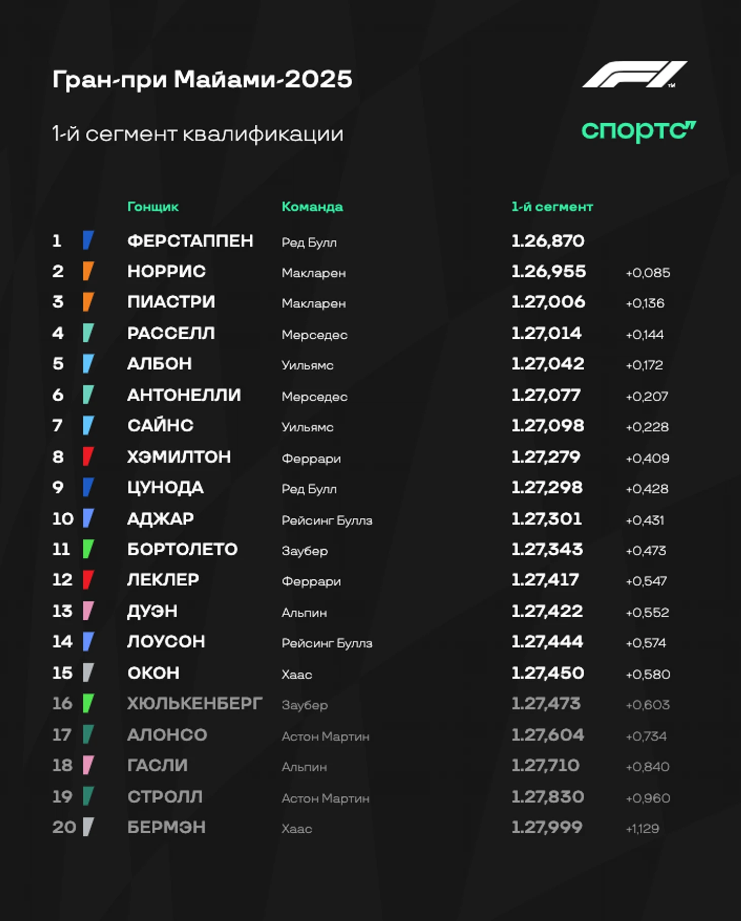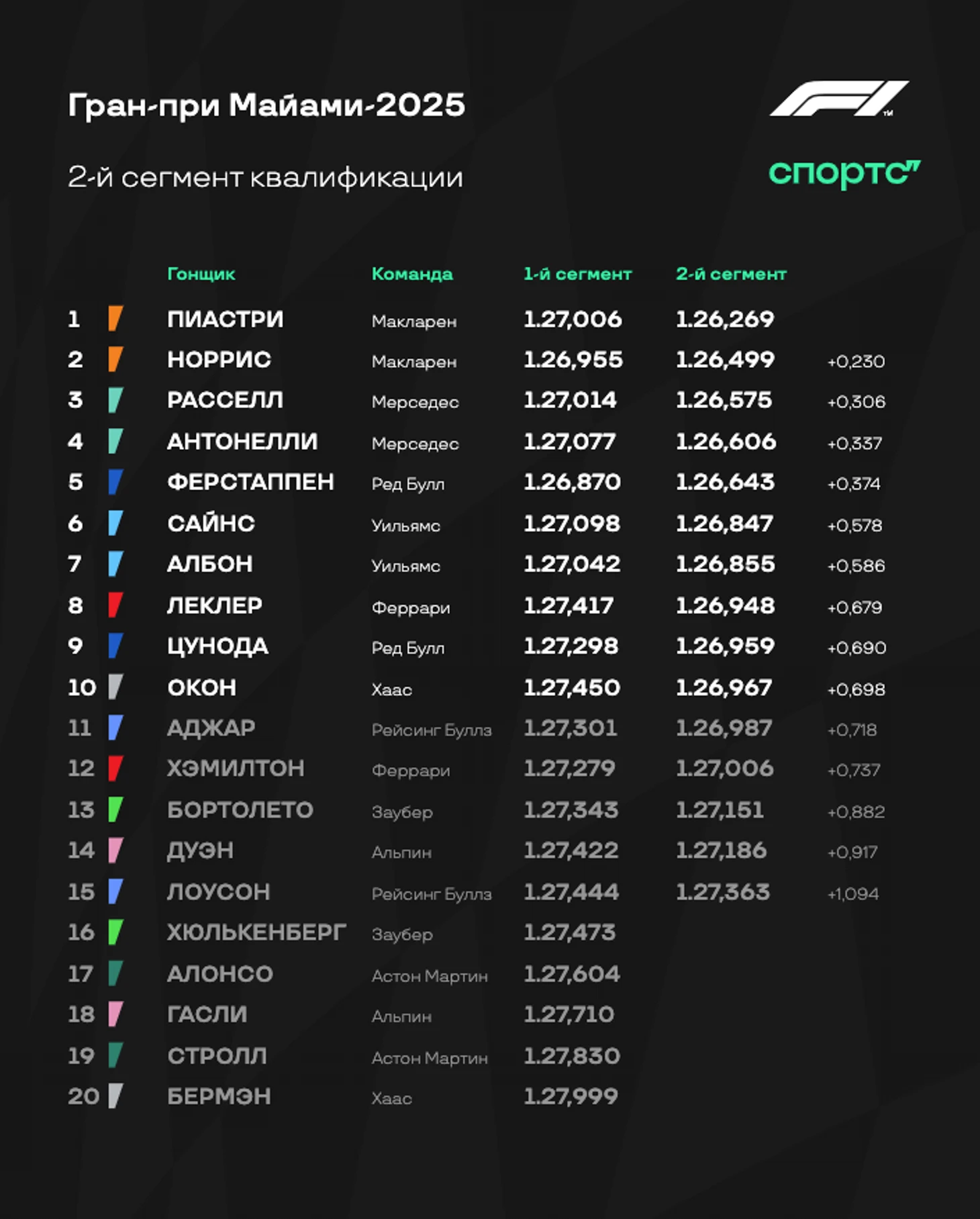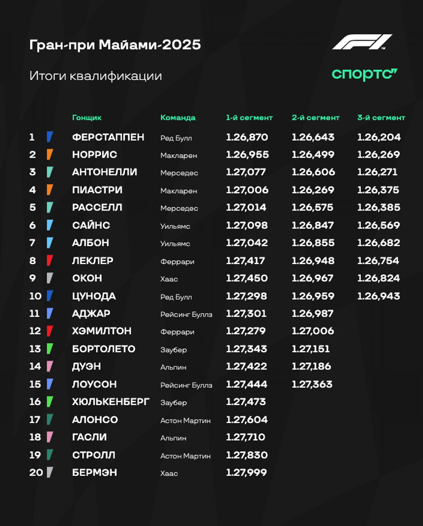 - Ферстаппен проехал блестящий, безошибочный круг. Кажется, уже норма, когда «Ред Булл» плох в первых сессиях уик-энда, но потом все-таки находит подходящие настройки - которые позволяют Максу раскрыться в полной мере. Жаль только. что его напарник Юки Цунода все никак не может обрести темп - спасибо хотя бы за проход в третий сегмент. - «Макларен» сегодня мог взять поул в лице Ландо Норриса. Британец после второго сектора уступал Ферстаппену всего несколько тысячных, однако все испортил в 17-м повороте, проехав по поребрику. Эта ошибка и стоила поула. Пиастри в целом слабо провел третий сегмент, не попав даже в первую тройку. Аномально слабая квалификация от лидера чемпионата. - В «Мерседесе» тоже необычная ситуация: Антонелли впервые опередил Расселла в основной квалификации! Кими очень хорошо смотрится в Майами, а вот Джордж что-то теряет в стабильности. №63 жалуется на проблемы со сцеплением. - «Феррари» проводит традиционный уик-энд: все хорошо вплоть до начала основных сессий. Как и в Китае (первом спринтерском уик-энде сезона), Хэмилтон отлично выступил в спринте, после чего провел очень слабую квалификацию. В Майами даже не прошел в третий сегмент. Шарль не лучше: уступил всем лидерам и обоим «Уильямсам», оказавшись только восьмым. - Кстати о «Уильямсах»: отличная сессия! Оба болида в топ-10 - причем в начале второй пятерки. Очень сильный результат от Сайнса и Албона. - Также нельзя не отметить выступления Аджара и Бортолето. Изак в очередной раз показывает сильный результат, а Габриэл не только опередил напарника, но и пробился в следующий сегмент. Для пилота за рулем аутсайдера - мощное достижение. Впереди кульминация Гран-при Майами - основная гонка, которая пройдет в воскресенье 4 мая в 23:00 по мск.