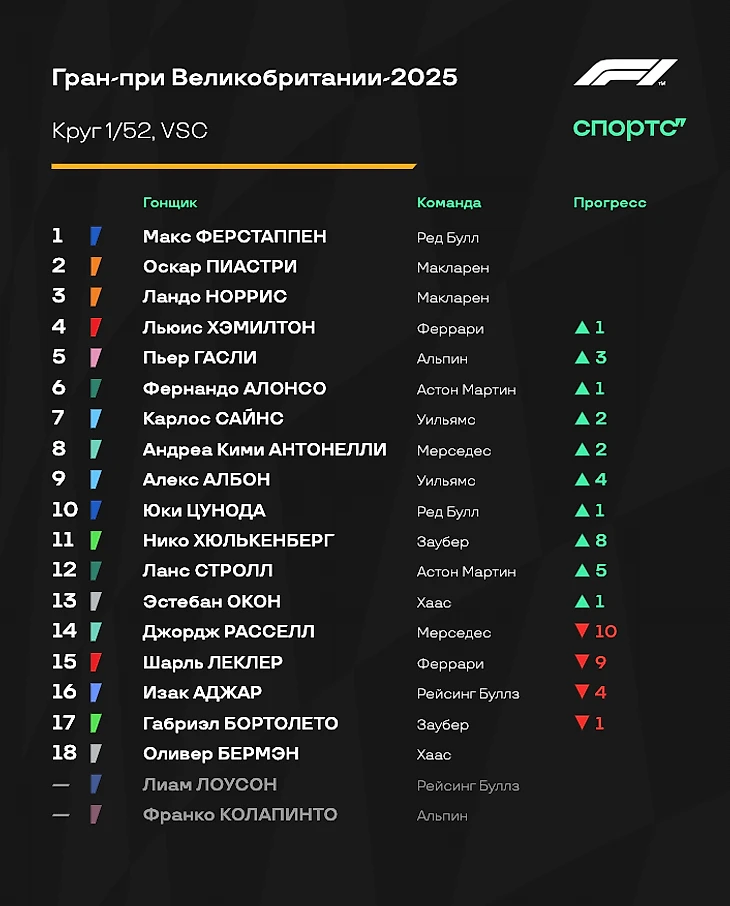 Поехали! Ферстаппен удержал лидерство, за ним Пиастри, Норрис и Хэмилтон.