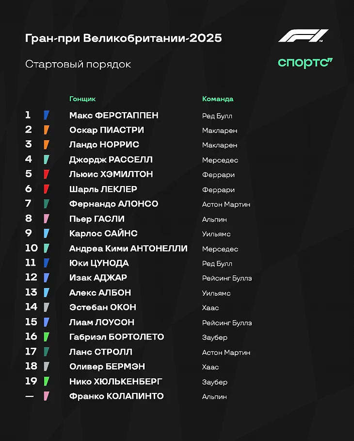 С поула будет стартовать Макс Ферстаппен, вчера выдавший идеальный круг и сумевший опередить конкурентов из «Макларена». Норрис с Пиастри, вероятно, попробуют отобрать у Макса лидерство уже на старте – но, опять же, очень многое зависит от погодных условий к моменту начала заезда.