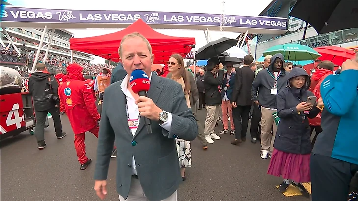 По состоянию на данный момент дождь прекратился - Мартин Брандл бродит по стартовой решетке и как обычно берет интервью.