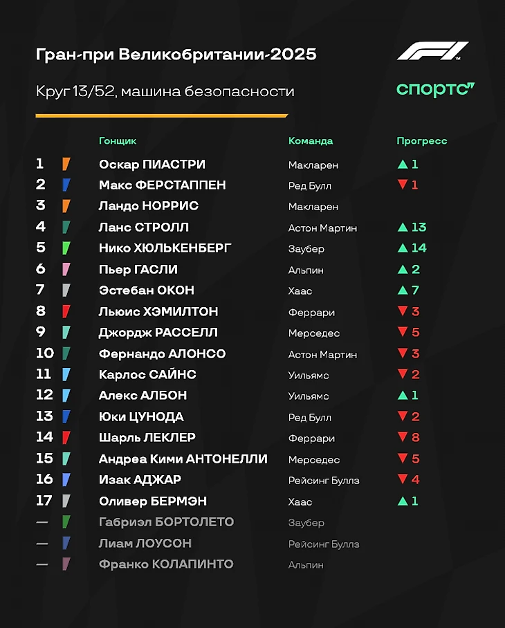 Тем временем, лидирующий Оскар Пиастри оторвался от Ферстаппена уже на 12 секунд! Норрис активно давит на Макса. «Макларены» в таких условиях чувствуют себя отлично.