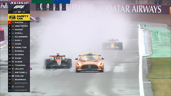 Дирекция гонки «останавливает» заезд, выпуская на трассу машину безопасности! На трассе слишком много воды, велик риск аквапланирования. К сожалению для Пиастри, весь его отрыв будет нивелирован.