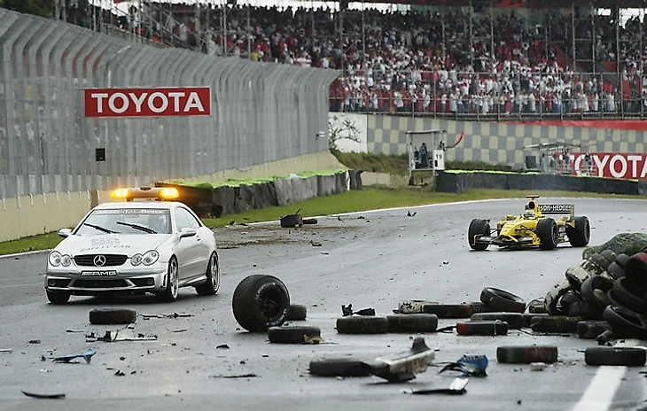 Можно смеяться и не верить австралийцу, но в той сумасшедшей гонке на «Интерлагосе» в 2003 году было возможно все, в том числе был шанс проехать Гран-при без дозаправок. Гонщики «Минарди» Джастин Уилсон и Йос Ферстаппен довольно быстро сошли, но пилот «Джордана» Джанкарло Физикелла доказал правильность подобной тактики. Итальянец дозаправился после старта за машиной безопасности и больше не останавливался. «Тихой сапой» Джанкарло поднимался все выше и выше в пелотоне, а к 55 кругу вышел в лидеры. Скорее всего, топлива не хватило бы до финиша, но в тот день все карты сложились. Из-за аварии Фернандо Алонсо был вывешен красный флаг и гонку решили не возобновлять. Изначально победа была присуждена Кими Райкконену, но затем оказалось, что ФИА допустила ошибку в хронометраже, и через несколько дней награду отдали Физико.