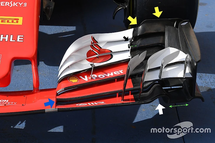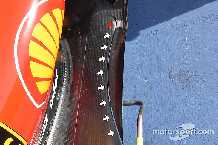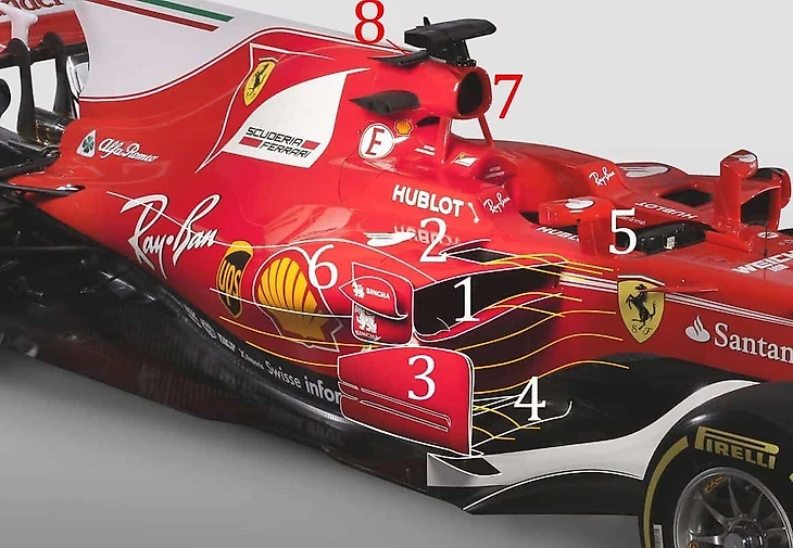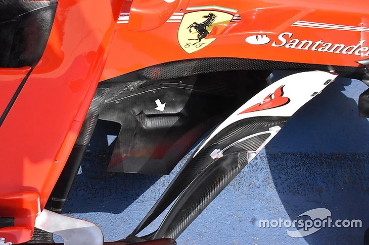 «Феррари» стала единственной командой, истолковавшей новый регламент так, чтобы сохранить практически перпендикулярный передний край понтонов, расположив перед ним несколько аэродинамических элементов, придающих потокам желаемую конфигурацию.