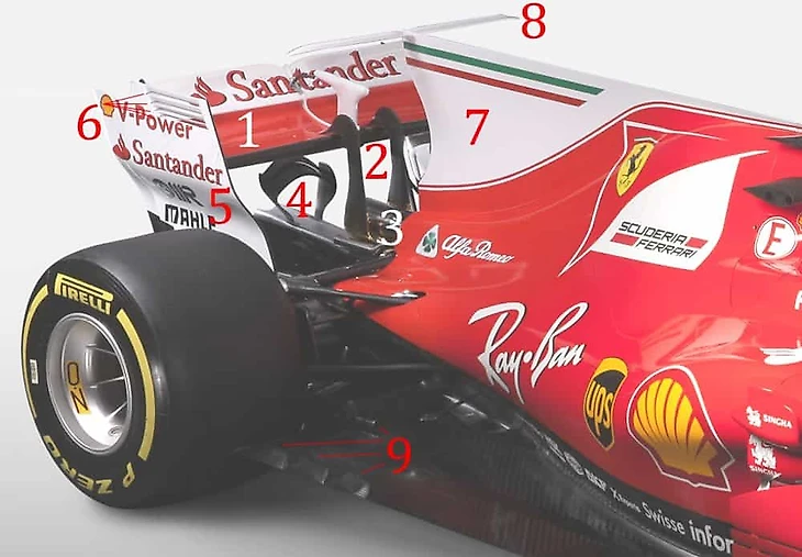 Сейчас «Феррари» остается единственной командой, использующей два пилона для крепления заднего крыла. Само по себе это решение кажется очень спорным, так как аэродинамически единственный пилон, как у всех остальных, гораздо выгоднее.