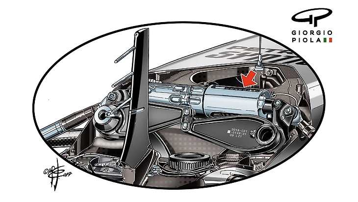S-образный воздуховод помогает ускорить воздушный поток под носом и направить его наружу, что помогает ограничить аэродинамическую подъёмную силу, противодействующую прижимной силе.