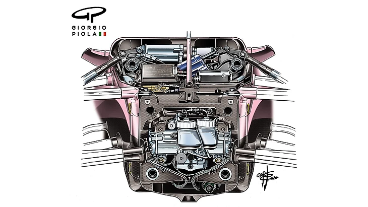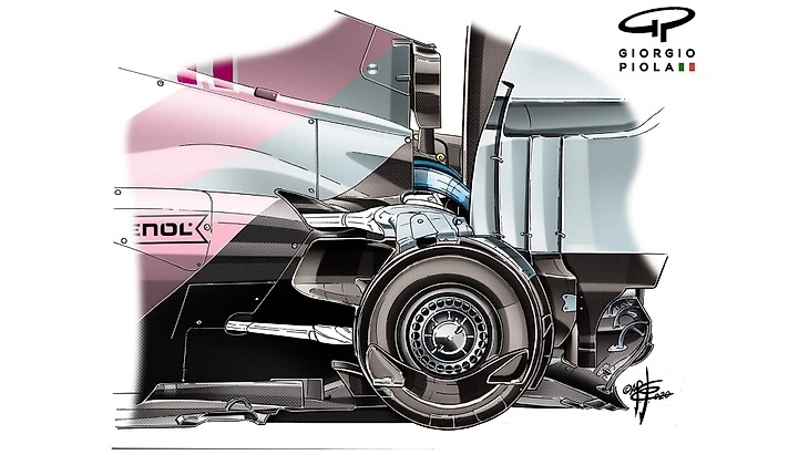 Отличные барабаны и S-образный воздуховод говорят о том, что аэродинамика вокруг каждой машины работает немного по-разному. Об этом также свидетельствует тот факт, что «Рейсинг Пойнт» наклонен вперед под большим углом, чем W10.