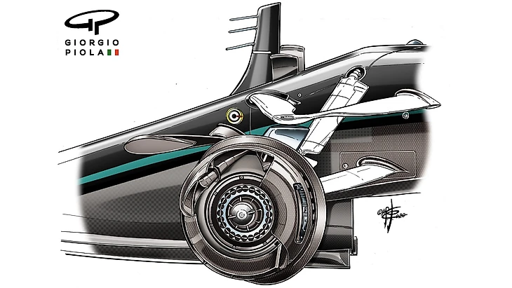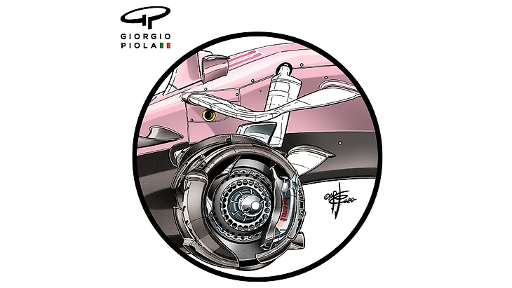 Барабан на «Мерседесе» полностью закрытый, а вот на «Рейсинг Пойнте» местами обнажается (это видно по надписи «Brembo» на тормозном суппорте). Однако задние барабаны идентичны.