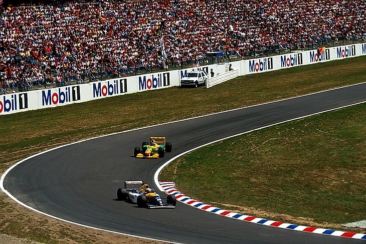 Зрители на Гран-при Германии 1993 года в восторге от Шумахера, идущего позади Проста.