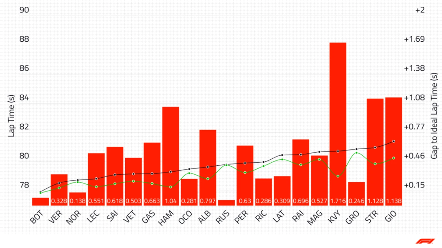 Лучший круг был рассчитан из суммы времен на десятках мини-секторов, на которые поделена трасса. Хэмилтон не смог выжать максимума. Он должен быть на секунду быстрее. Ланс Стролл, Даниил Квят и Антонио Джовинацци должны отыгрывать целые 1.7 секунды!