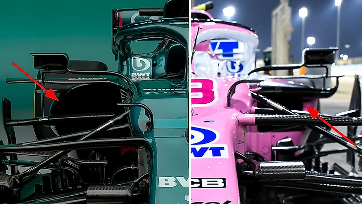 Лучше всего это узнать по изгибу боковых понтонов. От углового контура RP20 второй половины прошлого года отказались в пользу более изогнутой линии. Только выпуклость в месте расположения двигателя под обтекателем более выражена, чем на Mercedes W11. Это говорит о том, что кожух более тонкий в верхней части.