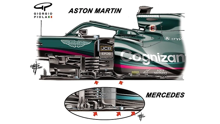 «Астон Мартин» использует аналогичные волны, но их меньше (как вы можете видеть на изображении ниже). В обоих случаях они выполняют одну и ту же функцию, но тот факт, что эта технология появилась одновременно на болидах с маленьким углом наклона означает, что она была просто необходима.