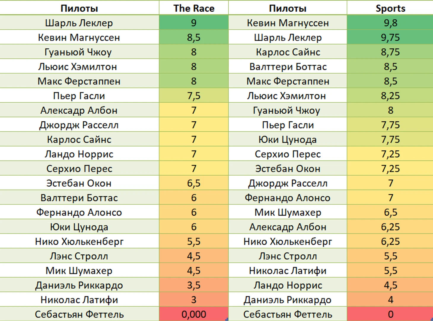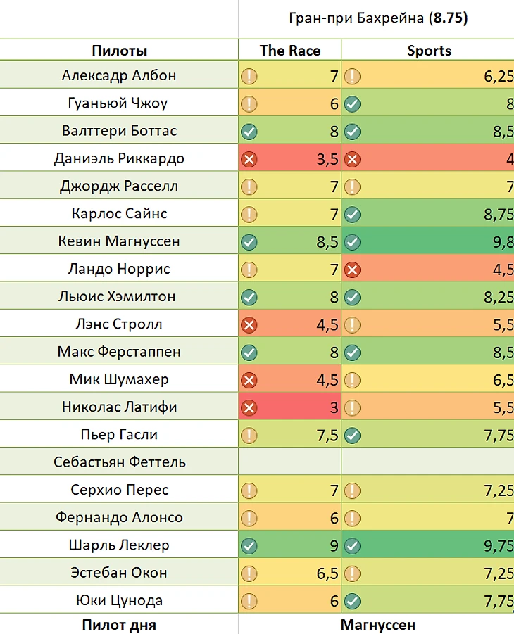 Средние оценки за сезон в сравнении новым ориентиром в лице издания The Race: