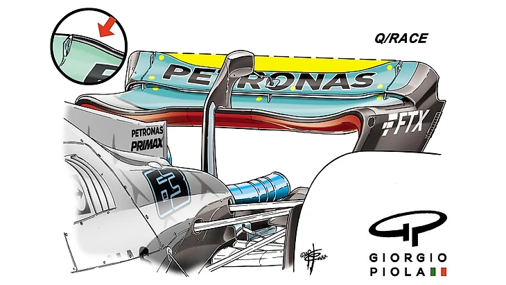 Аэродинамический обтекатель вокруг верхней защитной конструкции, на которой установлены зеркала и их лопасти, был изменен, чтобы «устранить небольшие участки разделенного воздушного потока». Кромка диффузора, ближайшая к задней шине, имеет уменьшенный изгиб, призванный уменьшить разделение воздушного потока в этой области. Это сопровождалось изменением торцевой пластины диффузора.
