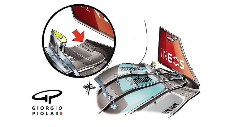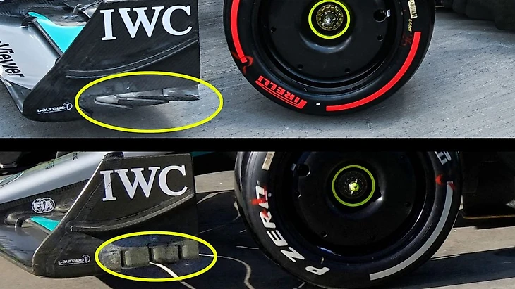 Чем мощнее отвод, тем чище должен быть поток воздуха под днище и вдоль боковых понтонов. Поиск альтернативных способов увеличения мощности отводящего потока теперь, когда боковые дефлекторы отменены правилами, является важной задачей для всех команд, и «Мерседес», похоже, нашел весьма изобретательную интерпретацию новых правил в отношении конструкции торцевых пластин.