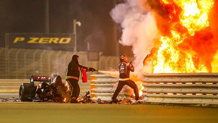 Ромену Грожану посчастливилось избежать ужасной аварии на первом круге Гран-при Бахрейна 2020 года. Вступив в контакт с Даниилом Квятом, болид «Хааса» покинул трассу на скорости около 200 км/ч, прежде чем врезаться в барьеры. Проехав барьеры, машина раскололась надвое и загорелась от удара в 67G! Грожан был спасен гало-устройством и смог выбраться из горящей машины.