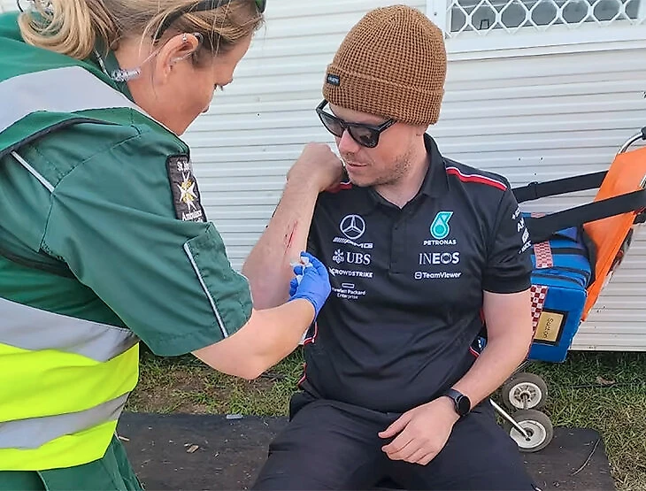 Свит добавил: «Я хотел посмотреть невероятный рестарт. Но уже после него мы поняли, что все пошло не по тому сценарию. Мне пришлось отправиться в медицинскую палатку. Скорая помощь была немного озадачена и не поверила, когда я сказал, что попал под обломки, потому что у меня были только салфетки и пластырь на руке, но потом они сняли ее. Они обработали рану спиртом и сказали, что мне может понадобиться укол от столбняка, если она станет красной или воспаленной.
