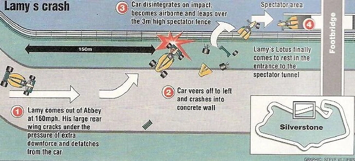 У Алессандро Дзанарди в самом начале гонки в шикане заклинило дроссельную заслонку, и после неудачной попытки починить ее на пит-лейн он сошел с дистанции. Позже команда заметила, что крепления заднего крыла на его машине треснули. Когда Дзанарди показали повреждения, он вспомнил аварию Лами на тестах в Сильверстоуне, представил, что то же самое произошло на Декетвилл-Террас, и понял, как ему повезло.