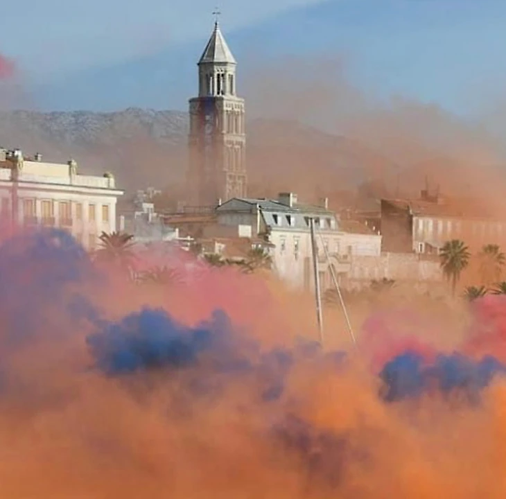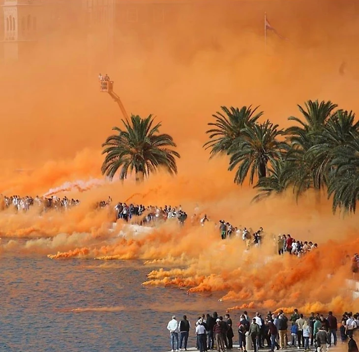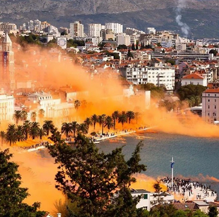 Мы вот вечно недовольно выступлениями наших клубов на европейской арене, хорватский Хайдук из города Сплит звёзд с неба не хватает и довольствуется малым. Был национальным чемпионом 15 раз, а в еврокубках добирался максимум до 1/4 ЛЧ. Поэтому его фанаты из Торсиды Сплит, отмечая 70-летие сами и запустили «звезды» в небо, устроив необыкновенное пирошоу на весь город. Торсида известна тем, что является старейшей фанатской организацией в Европе, а также одной из самых многочисленных. Только вдумайтесь: главному сопернику Хайдука Динамо Загреб 75 лет, а Торсиде 70.