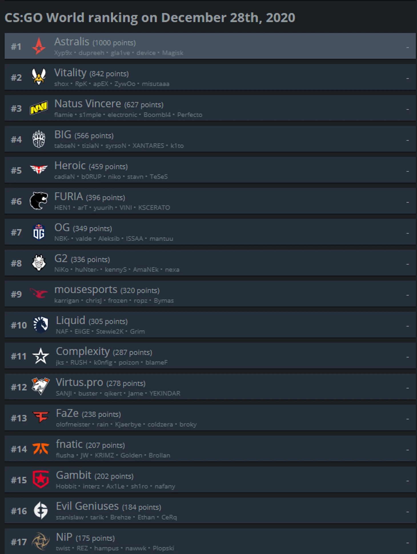 Fnatic, неплохо начавшие 2020-й, даже были топ-1 мира, хоть и недолгое время, во второй половине года скатились до уровня середняков и закончили на 14 строчке.
