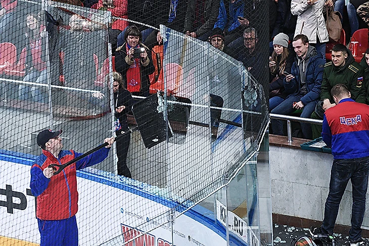 В итоге он не только не попал по нападающему «Локомотива» Эмилю Галимову, но и остановил матч на 10 минут – все это время в ЛДС ЦСКА меняли выбитое стекло.