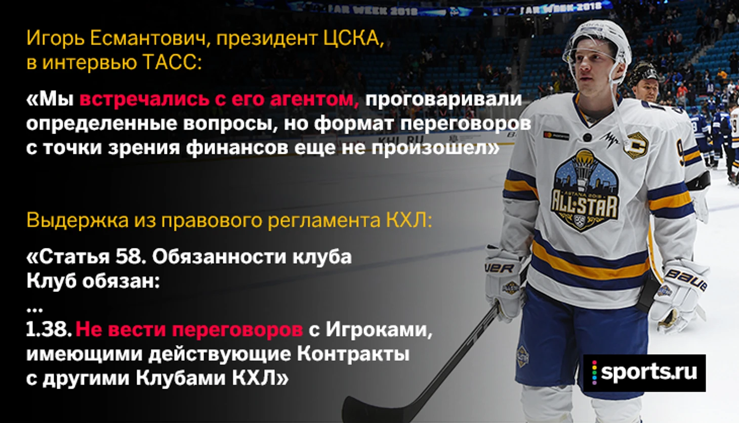 Комментарий лиги по ситуации однозначен: ЦСКА ничего не нарушил. «Исходя из слов президента ЦСКА Игоря Есмантовича, клуб встречался с агентом нападающего ХК «Северсталь» Дмитрия Кагарлицкого, что не нарушает положения данной статьи регламента КХЛ».