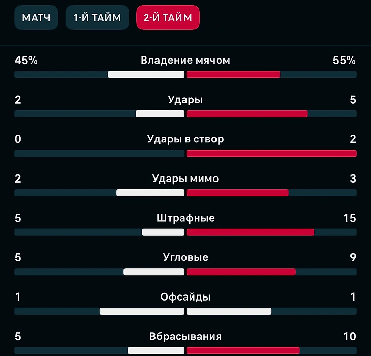 2 второй тайм: Спартак намного меньше чем в первом тайме и Ростов больше владел мячом 45/55.