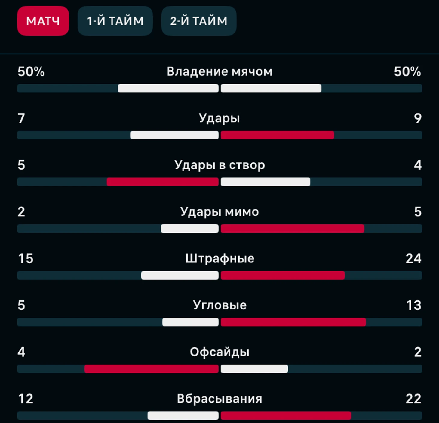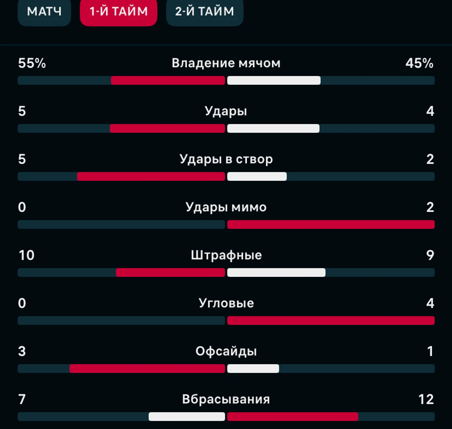 В первом тайме «Спартак» намного больше владел мячом в середине первого тайма владения было 65/35 в пользу «Мяса», а за весь тайм 55/45 в пользу Москвичей.