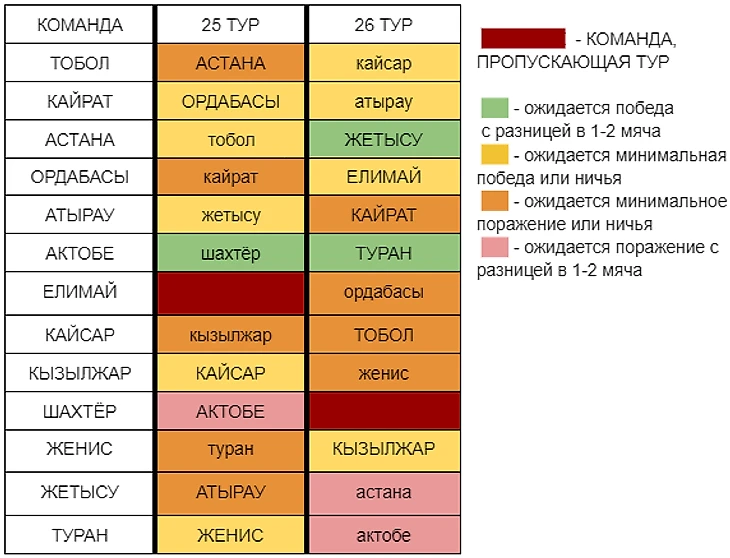 В этом туре не сыграет «Елимай», а потом у команды из Семея выезд в Шымкент - так что убираем Рейеса, Яшина и им подобных навсегда. Привлекает календарь «Актобе», но сама команда в кризисе - непонятно, кто именно оттуда нужен. Неплохой календарь у «Кызыл-Жара» и «Астаны» - однако празднующий в этом году 70-летие «Кайрат» может на флажке обогнать столичный клуб. Поэтому борьба за чемпионство будет острой!