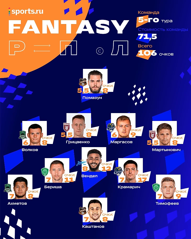 Сборная пятого тура Мир РПЛ в фэнтези-стиле – собрать такую было почти нереально. Кстати, в реальности лучшим оказался вообще почти случайный состав.