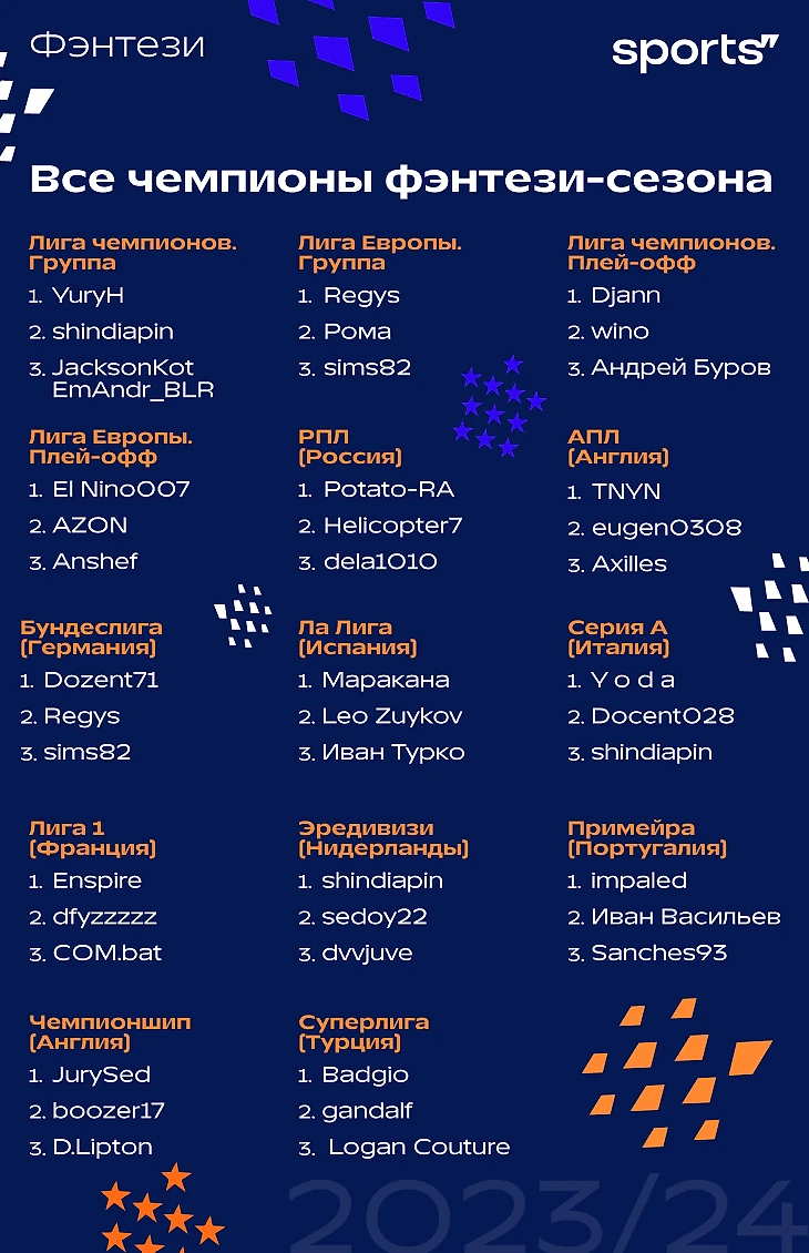 14 футбольных фэнтези-турниров уже завершились, так выглядит стена чемпионов-2023/24.