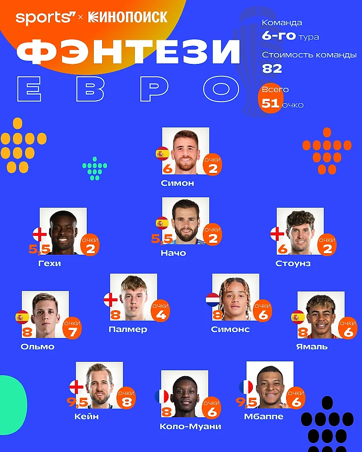 Итоги 1/2 финала фэнтези Евро-2024. Впереди финал, до 22:00 мск в воскресенье, 14 июля, можно сделать неограниченное количество замен.