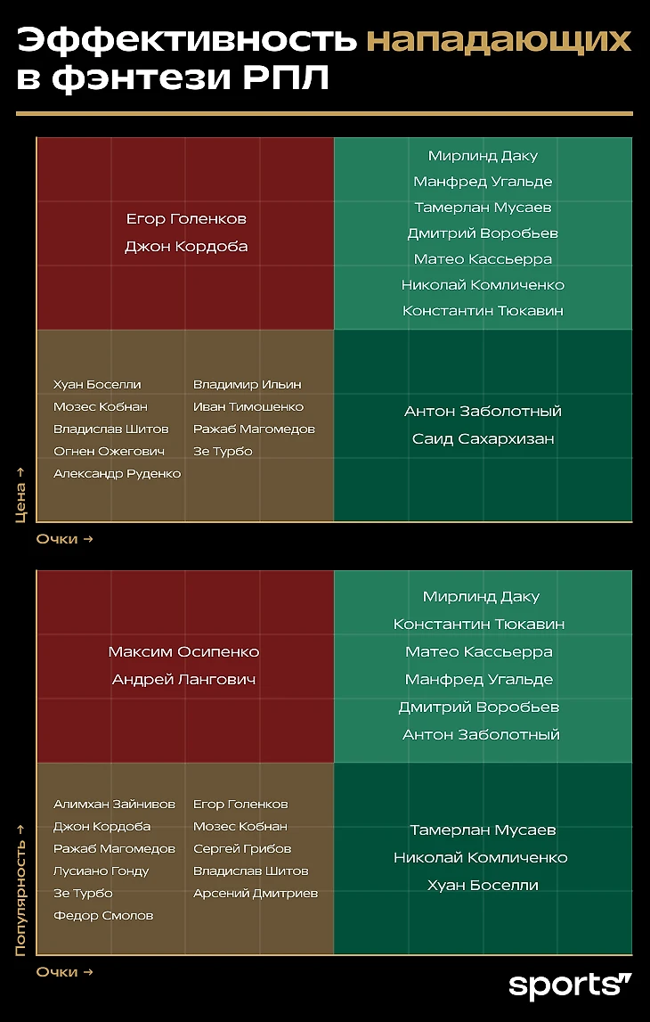 Вот 20 самых популярных и 20 самых эффективных по очкам (это не одно и то же) футболистов этого сезона РПЛ. Для каждой позиции – по две картинки, на них соотношение цены и популярности к очкам.